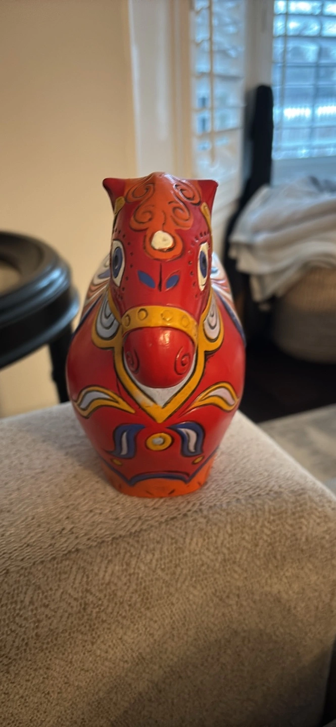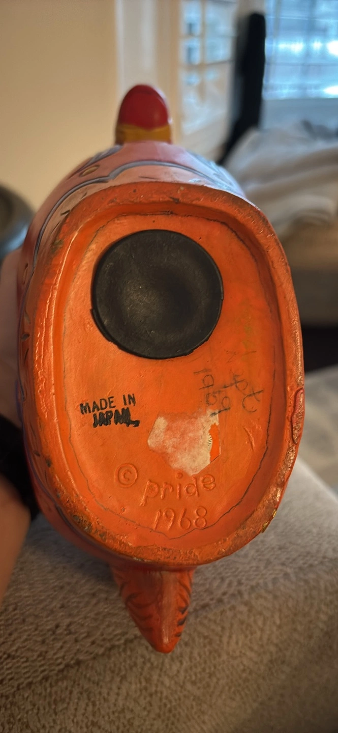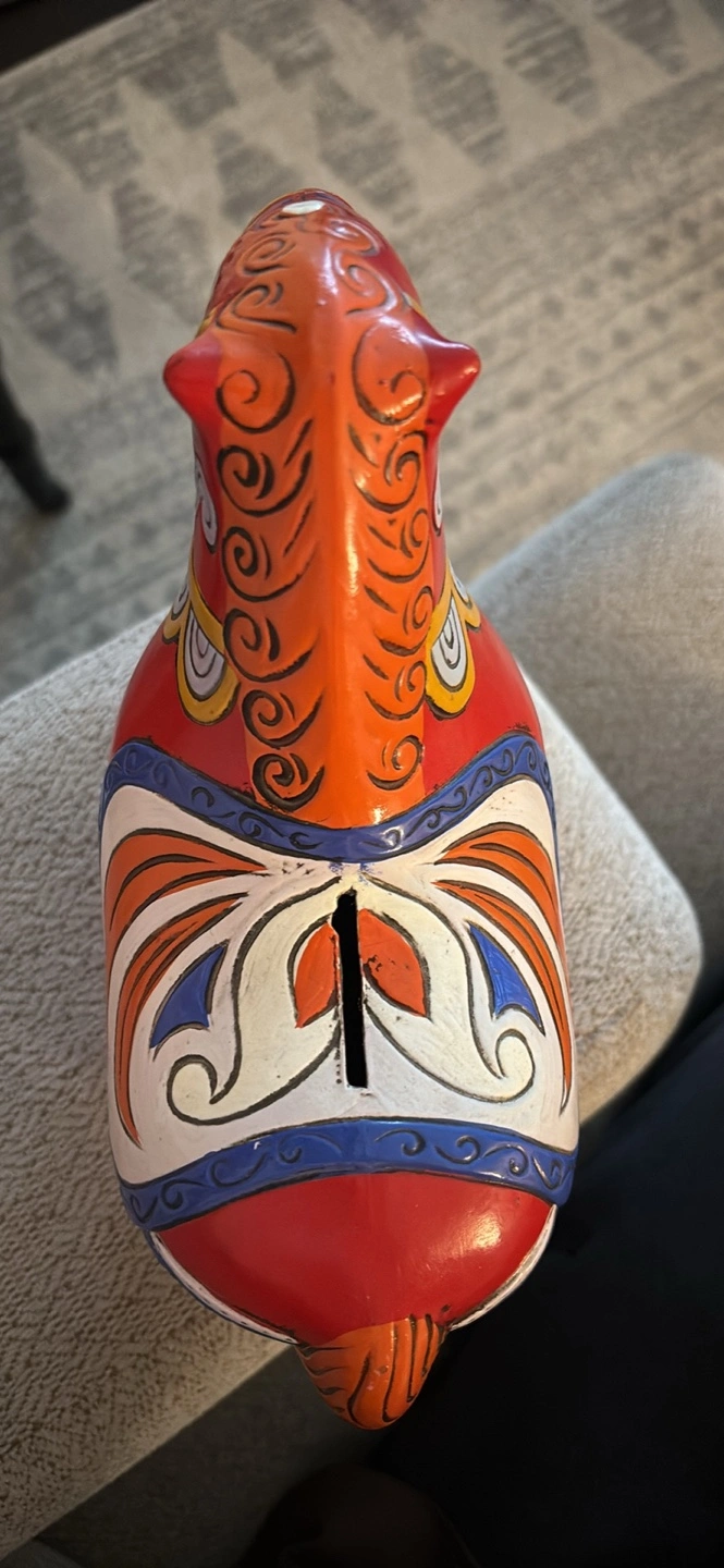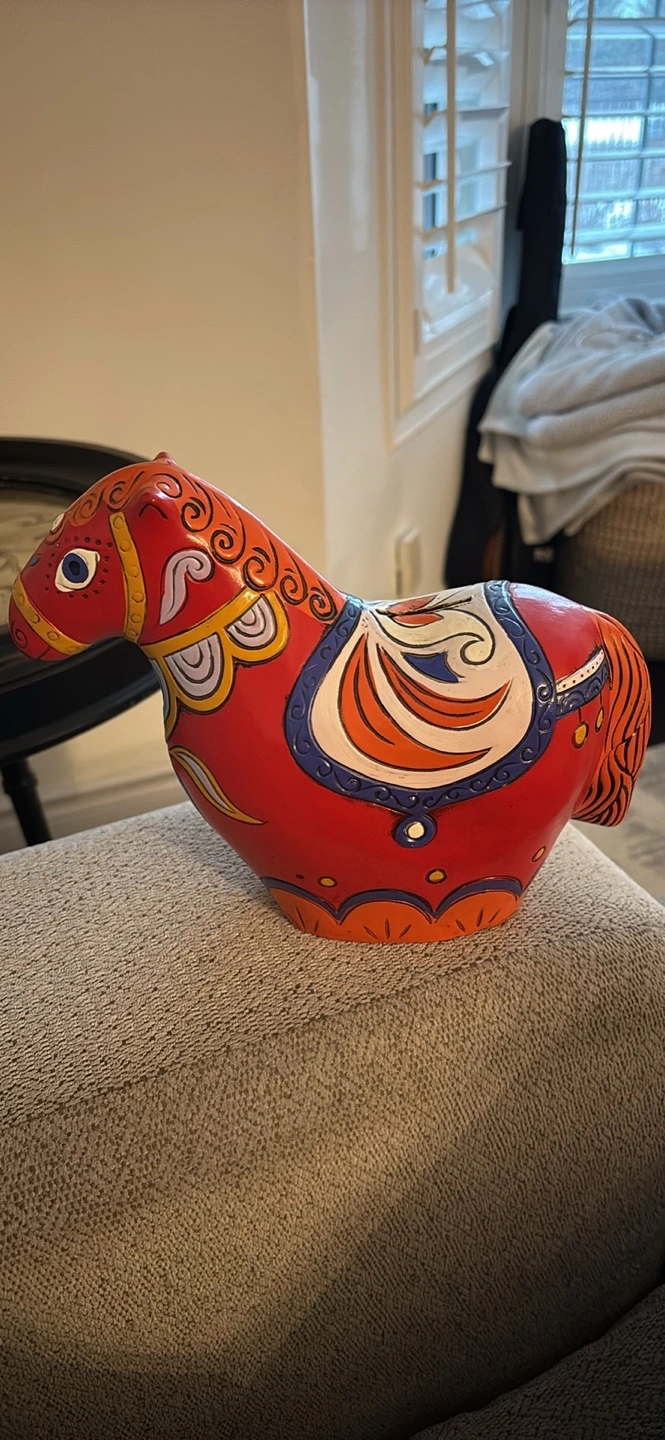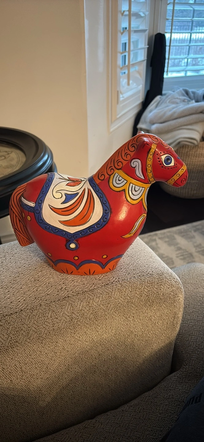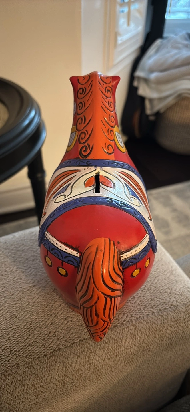 Adorable vintage hand-painted RARE Dala horse coin bank by Pride Creations. Features vibrant colours and beautiful design. Decent size, perfect for a desk or shelf. Slot on the back for coins with opening at bottom signed ‘PRIDE’ 1968 Made in Japan