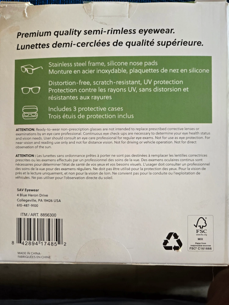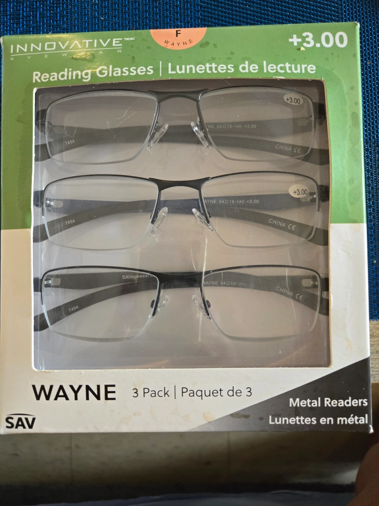 4943 pack reading glasses. New in box. stainless steel frames, silicone nose pad, distortion free, scratch resistant UV protection. also includes 3 protective cases and a cleaning cloth