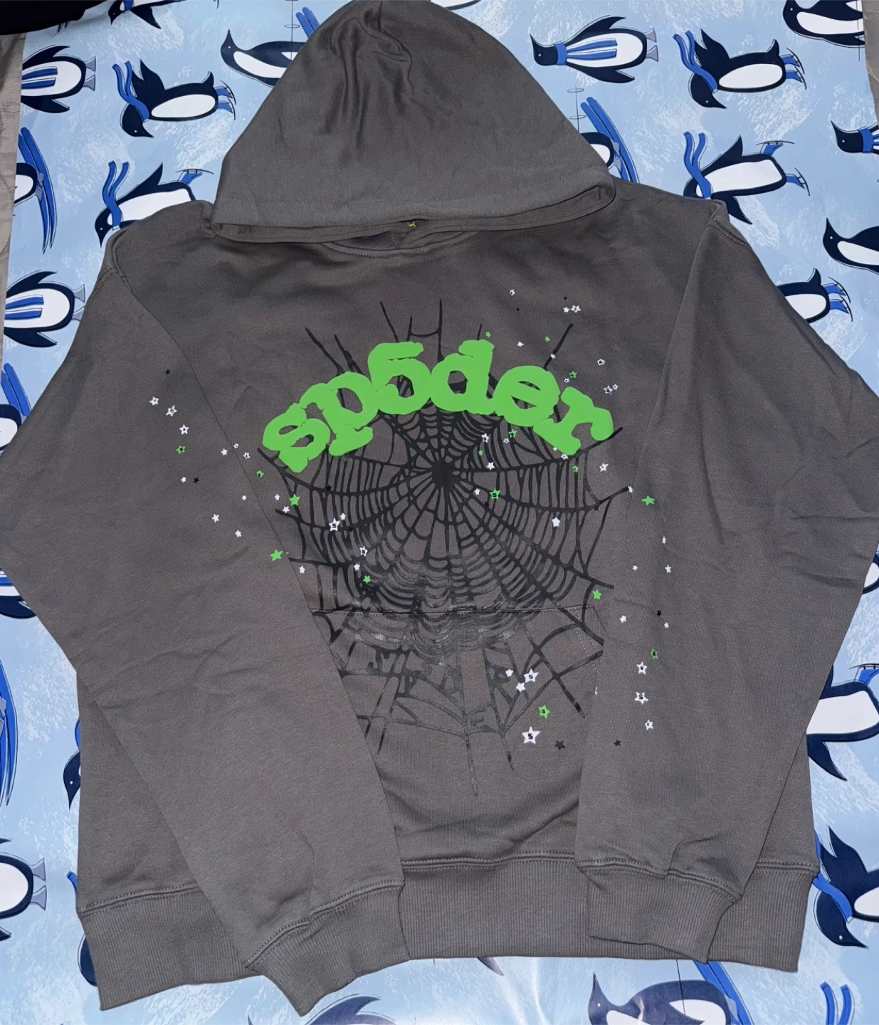 10Selling a grey Sp5der hoodie with a spiderweb design. It's in great condition and has a unique look!