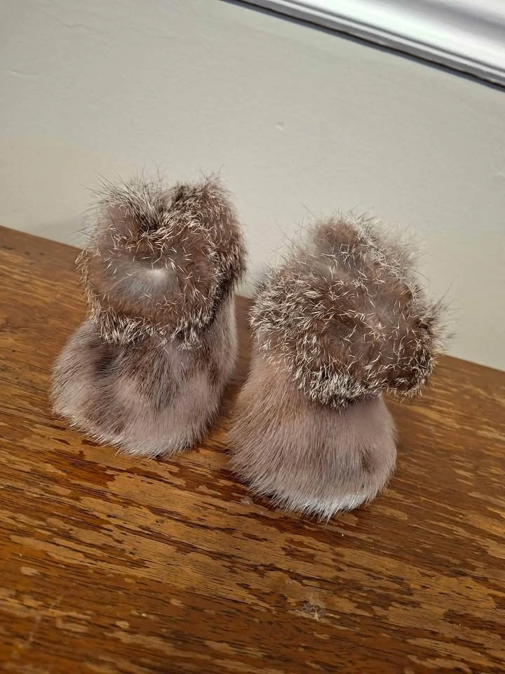 15Handmade real fur baby shoes. I don't remember what kind of fur or what size, but they would fit a baby around 3-6 months I think. Would be super cute for winter or even a Christmas present for an expecting mother. Pickup near Highbury and Cheapside