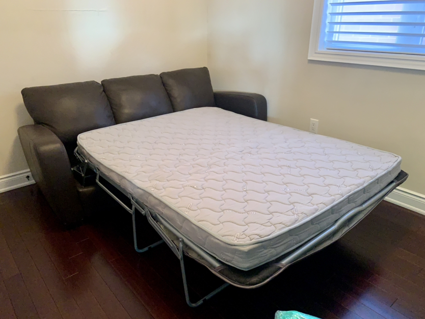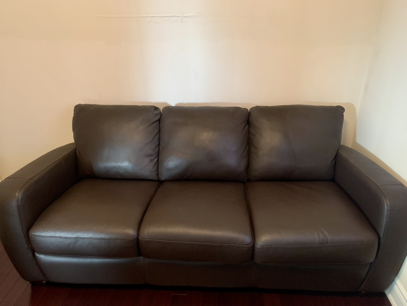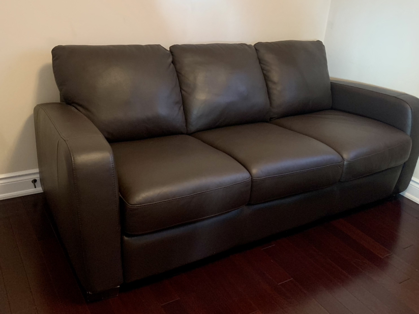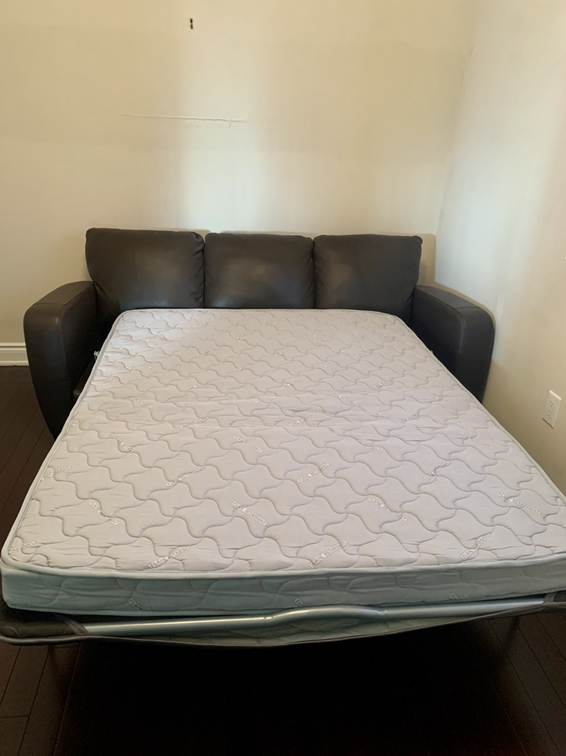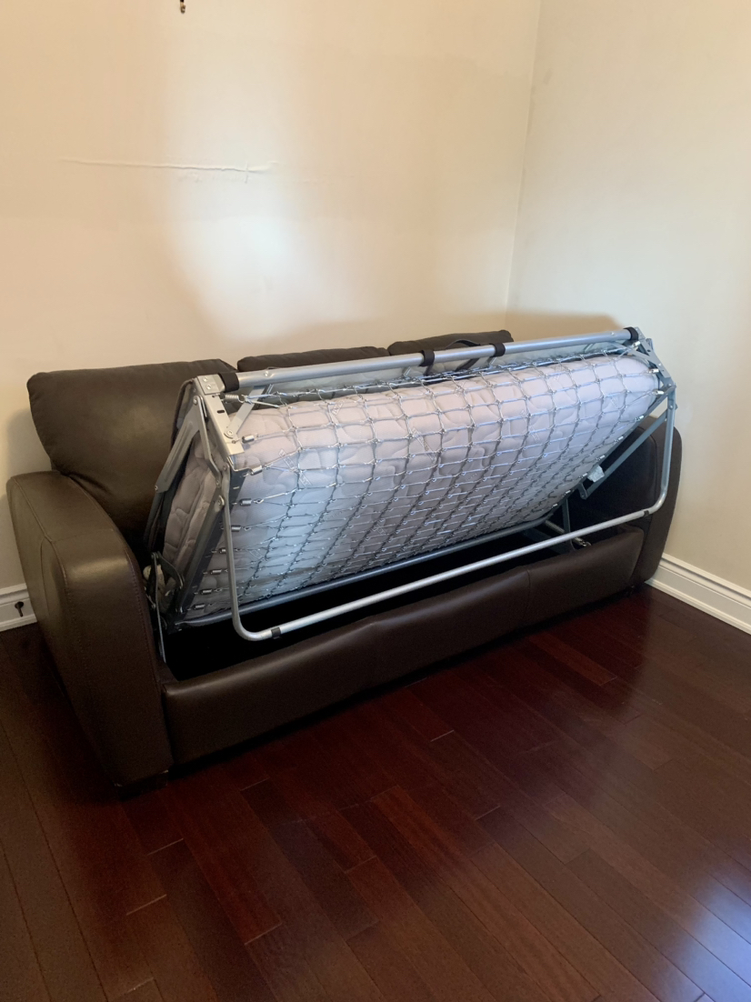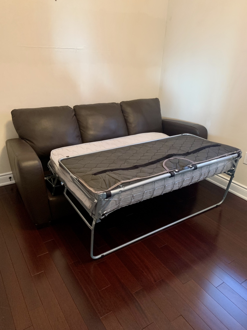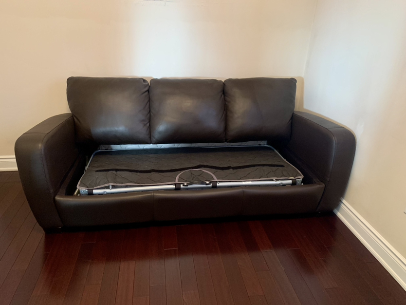 38Real leather, chocolate brown , like new, great quality, couch/sofa transforms into queen size bed, great as extra bed during holidays, easy to use. Please see pictures. Pick up only.