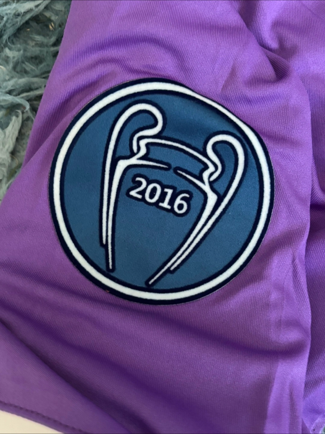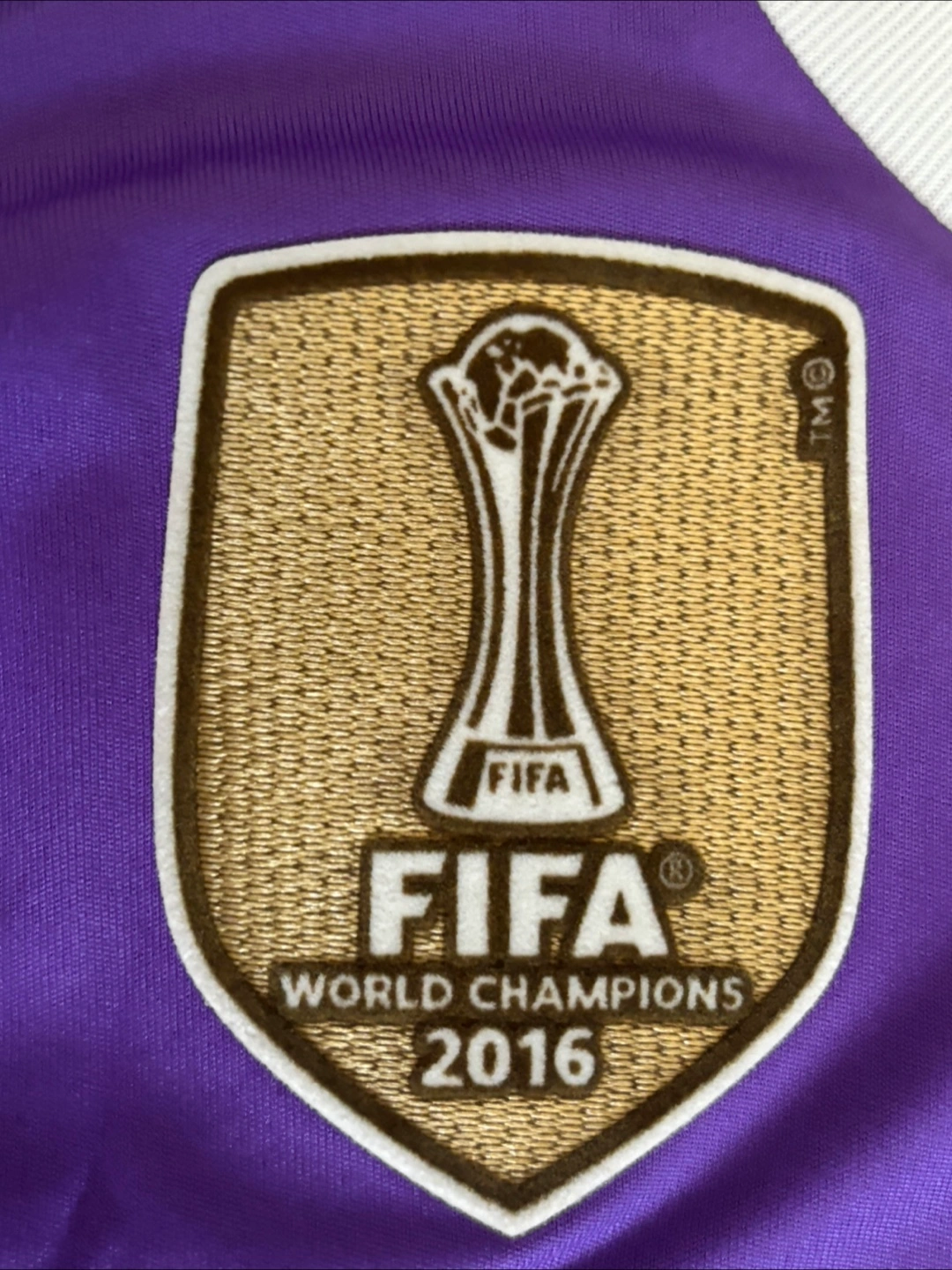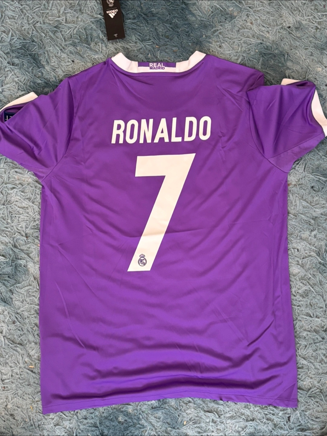 10Selling a Real Madrid jersey with Ronaldo's name and number on the back! It's purple and features the Adidas logo and the Fly Emirates sponsor logo on the front. There are also FIFA World Champions 2016 and UEFA Respect patches on the sleeves. Size large Send me a message for questions and concerns!
