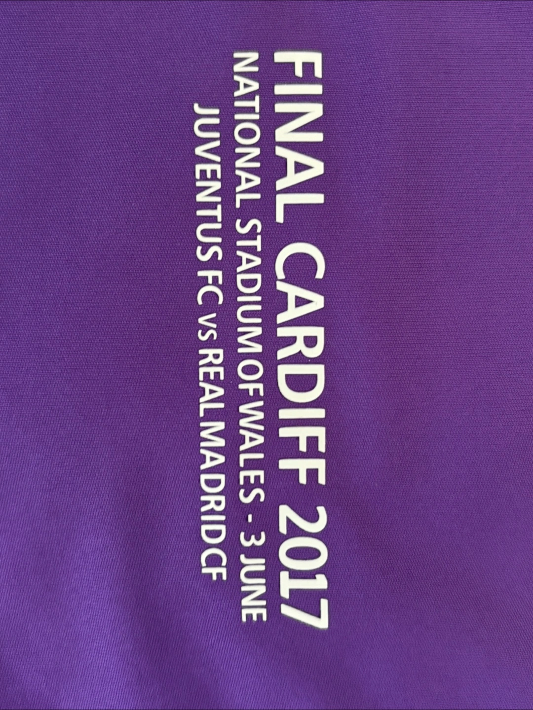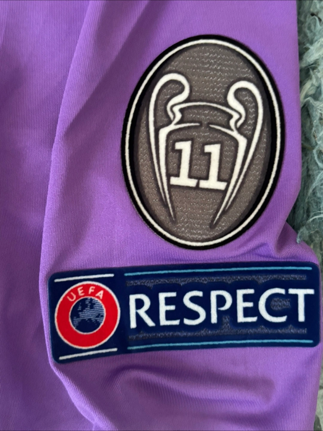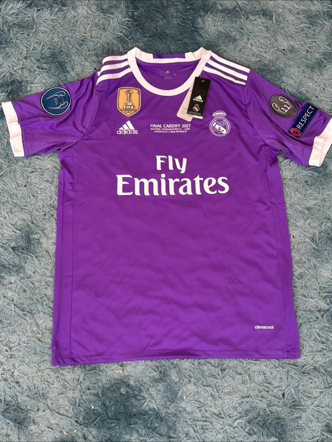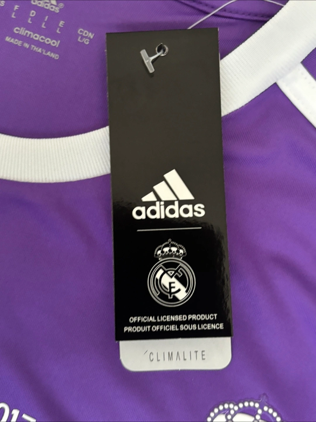 10Selling a Real Madrid jersey with Ronaldo's name and number on the back! It's purple and features the Adidas logo and the Fly Emirates sponsor logo on the front. There are also FIFA World Champions 2016 and UEFA Respect patches on the sleeves. Size large Send me a message for questions and concerns!
