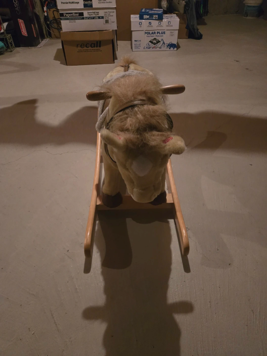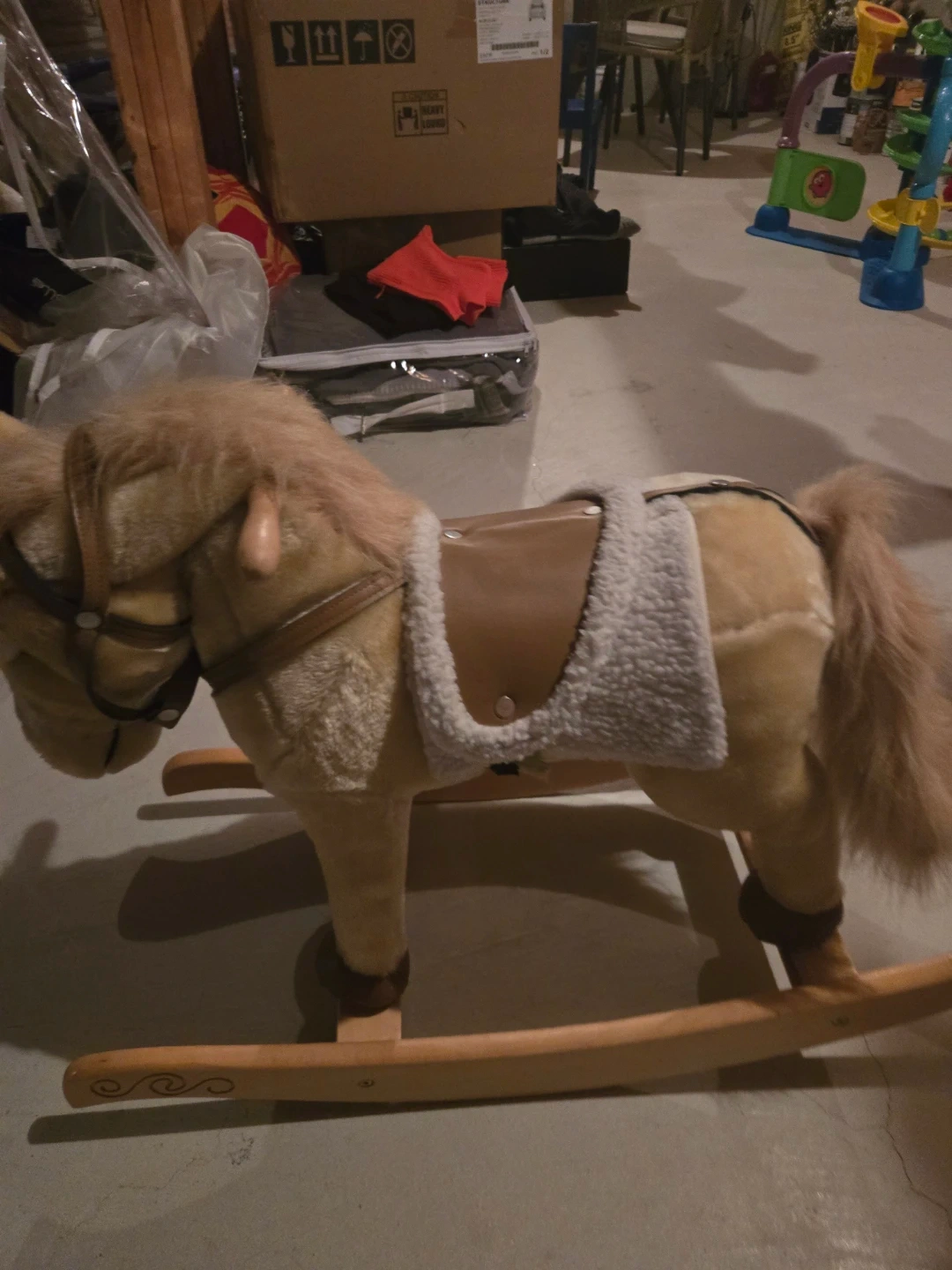 This is a soft plush rocking horse on a wooden base. It has a realistic mane and tail, with a saddle for riding. It's a fun toy for kids to enjoy. Suitable for playtime!