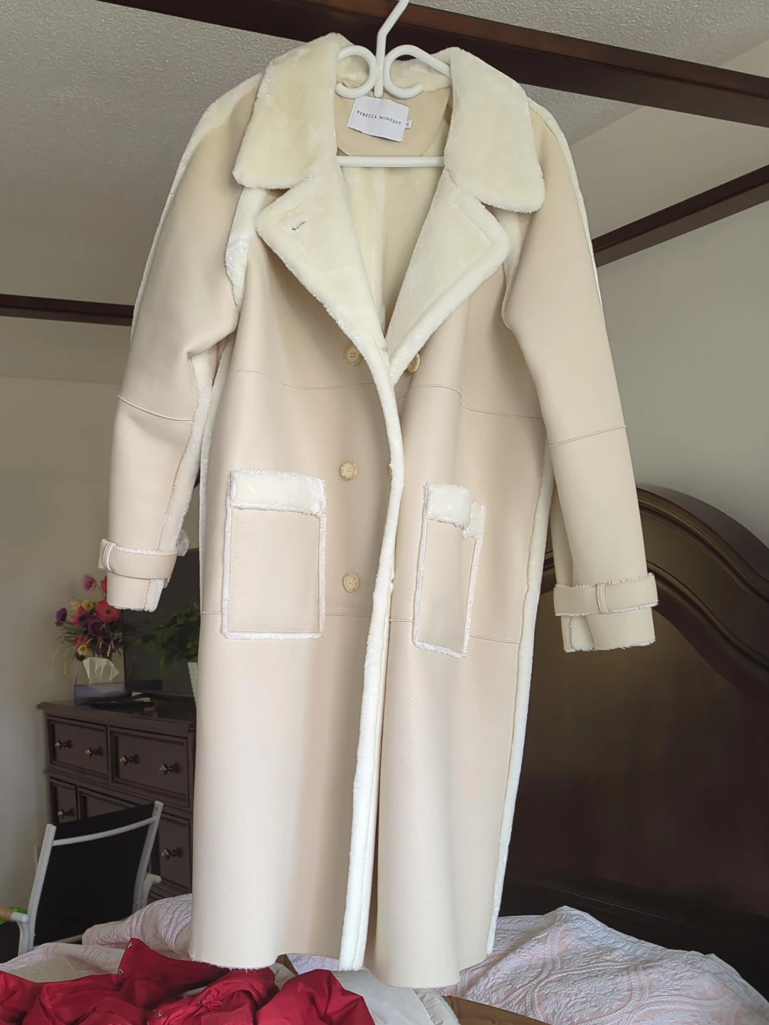 60Selling a Rebecca Minkoff coat with faux shearling trim! It's a cream colour and would be perfect for fall or winter. It's in great condition!. The size is XL, very warm outside but It does not come with hood.