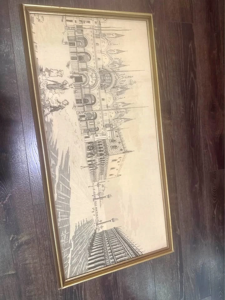 Beautiful vintage woven tapestry depicting Piazza San Marco and the Doge’s Palace in Venice, Italy. This mid-century textile artwork is created using a jacquard-style weave, giving it a textured, elegant look.