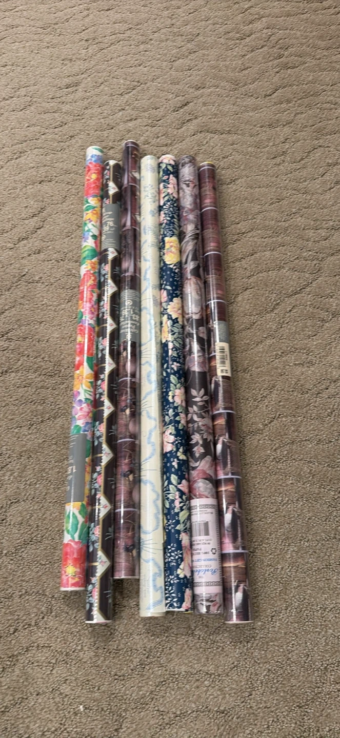 Selling a bundle of 7 rolls of gift wrap in various floral and patterned designs. Paper material. Some rolls show pricing and branding details from when they were purchased.