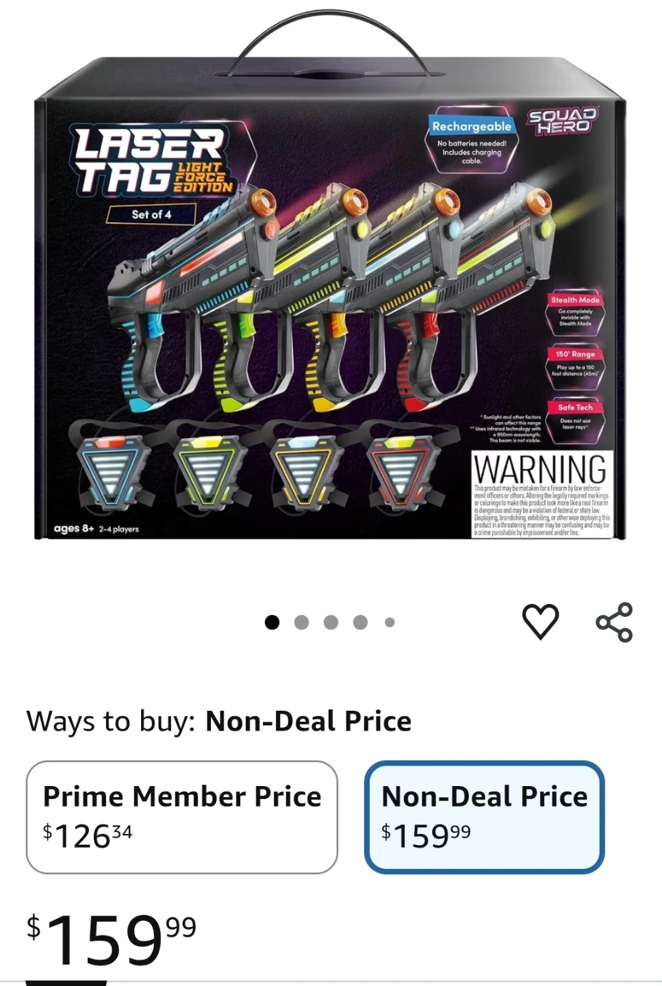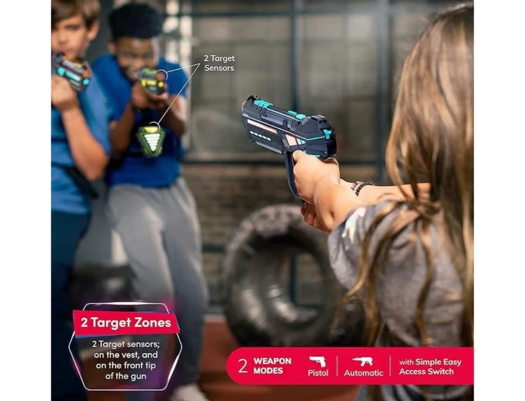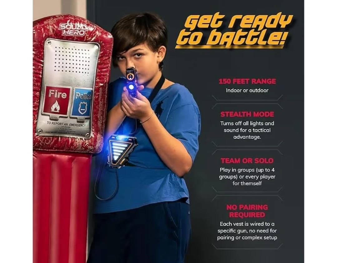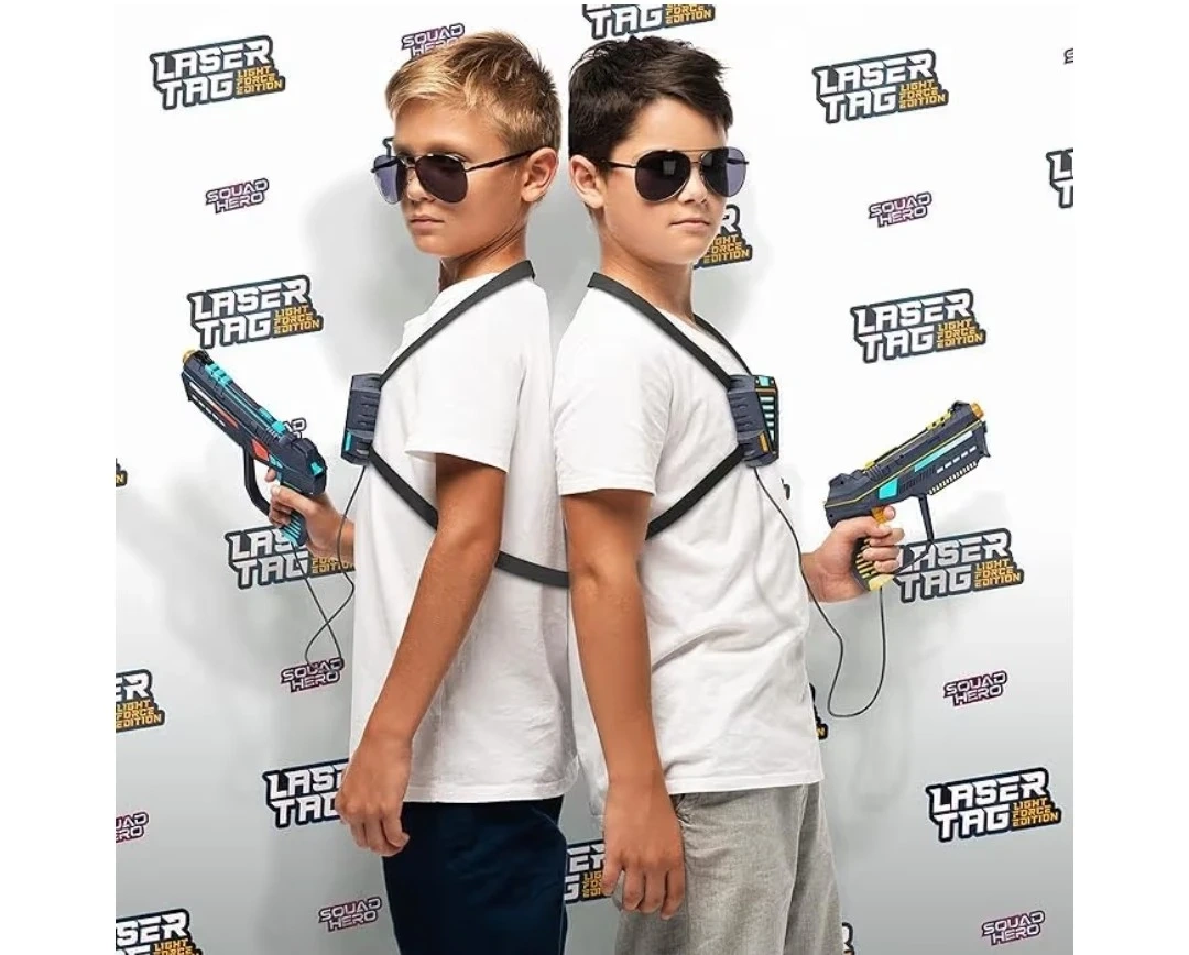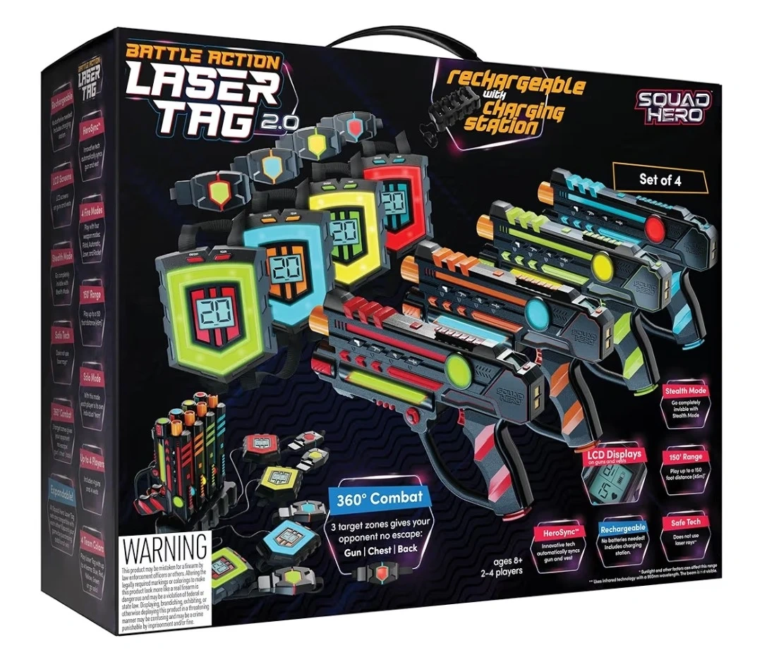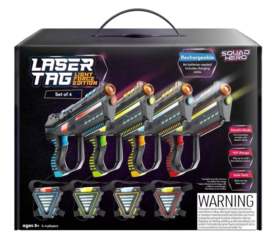 26Brand New in Box Original Price: $159+Tax=$179 Selling Price: $80 (55% off) Great for Christmas gift, Birthday gift Laser Tag Light Force Edition: Delivers hours of action-packed, adrenaline-pumping fun wherever you set up the battleground! With quick setup and long-life rechargeable gear, you'll be up and running - and shooting - in no time. Just pick your teams (or go solo!), strap on your gear, and get ready to battle! Run, hide, roll, take aim, and eliminate your enemies to win the game! Includes: 4 guns and vests, 4-in-1 charging cable. Rechargeable gear – You never have to stop the game action to change a few dozen batteries. The guns and vests are fully rechargeable! The set includes a 4-in-1 charging cable to effortlessly charge all the gear at once. You can play approx 8 games per charge. Premium Specs: Fully Synced – The guns and vests are wired together to ensure a seamless experience! Lives and team data are automatically synced. Multi-Zone Targets: Two target zones (chest and gun) give your opponent no escape. Safe Tech: Uses child-safe infrared emission and not laser rays. More advanced features... Choose between two weapon modes (Pistol and Automatic); Stealth Mode; Team or Solo mode; 150-foot reach; you can add unlimited guns and vests as all Squad Hero LightForce Laser Tag sets are compatible! All this makes LightForce Laser Tag an intense, hi-tech, and altogether awesome home-based infrared laser tag game!