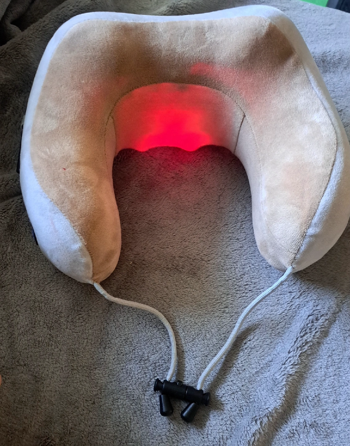Selling a U-shaped electric neck massage pillow. This suede pillow are designed to provide support for the neck and shoulders, and they often include features like heat and vibration to help relieve muscle tension. The U-shaped design is intended to fit the curve of the neck and provide 360-degree support. It feature multiple massage modes and intensities. This pillow, like the one pictured with the red light, also have a heating function to further relax muscles. They are typically portable and can be used for travel, at home, or in the office. Similar product is being sold at Amazon for $90.