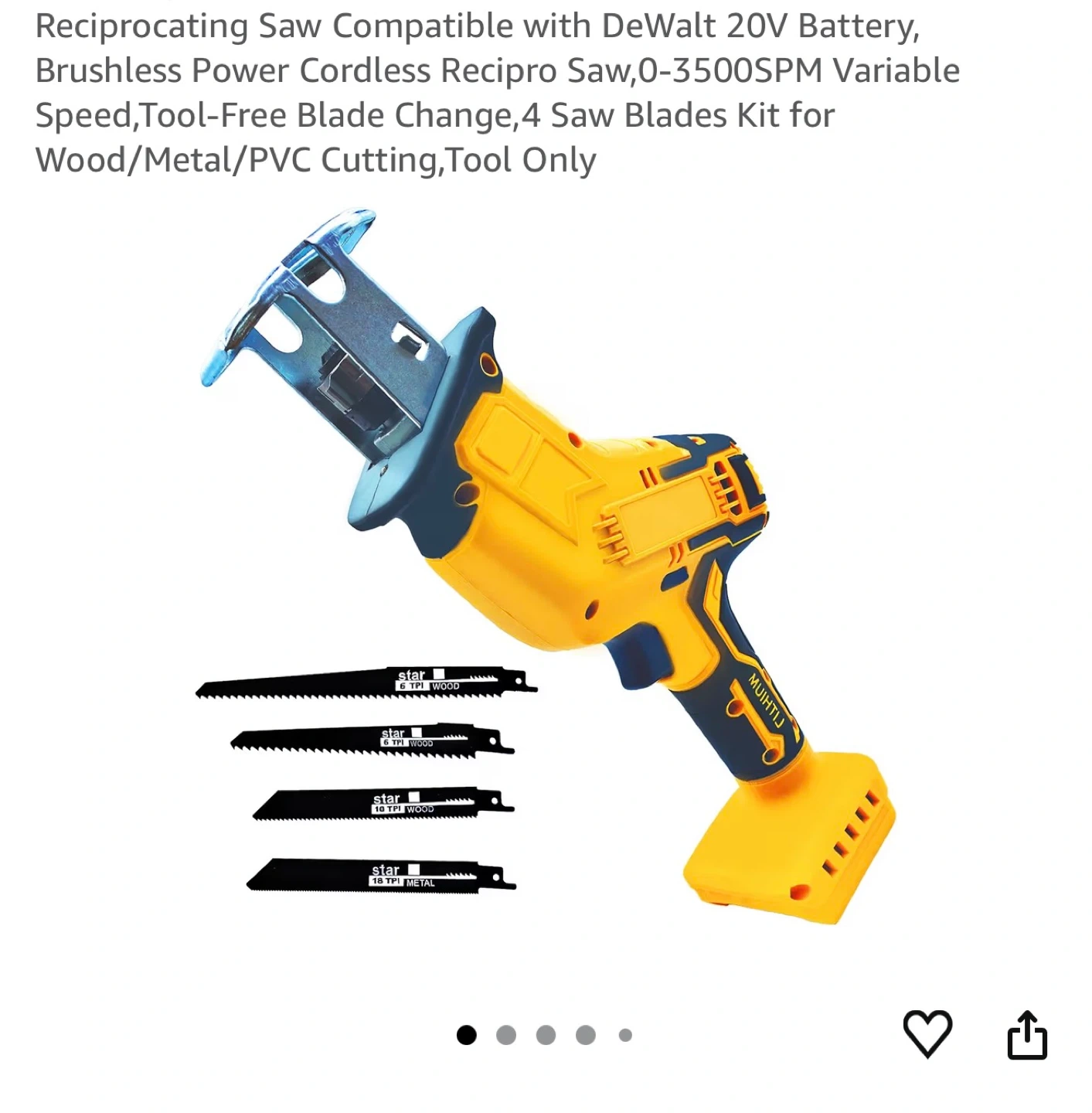 63Selling a Reciprocating Saw that's compatible with DeWalt 20V batteries. It features a brushless motor and variable speed from 0-3500 SPM. It's designed for tool-free blade replacement and can cut wood, metal, and PVC. It comes with 4 saw blades.