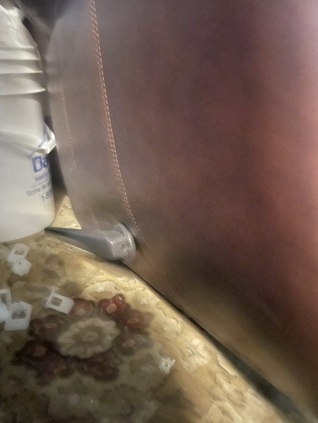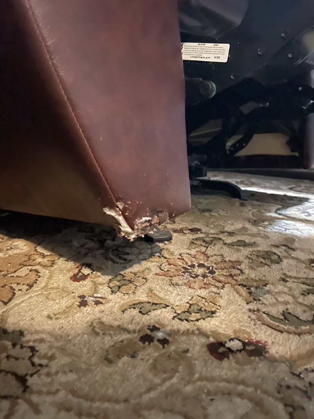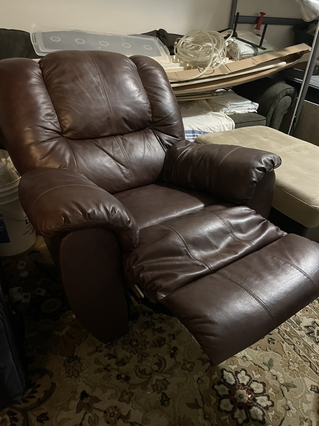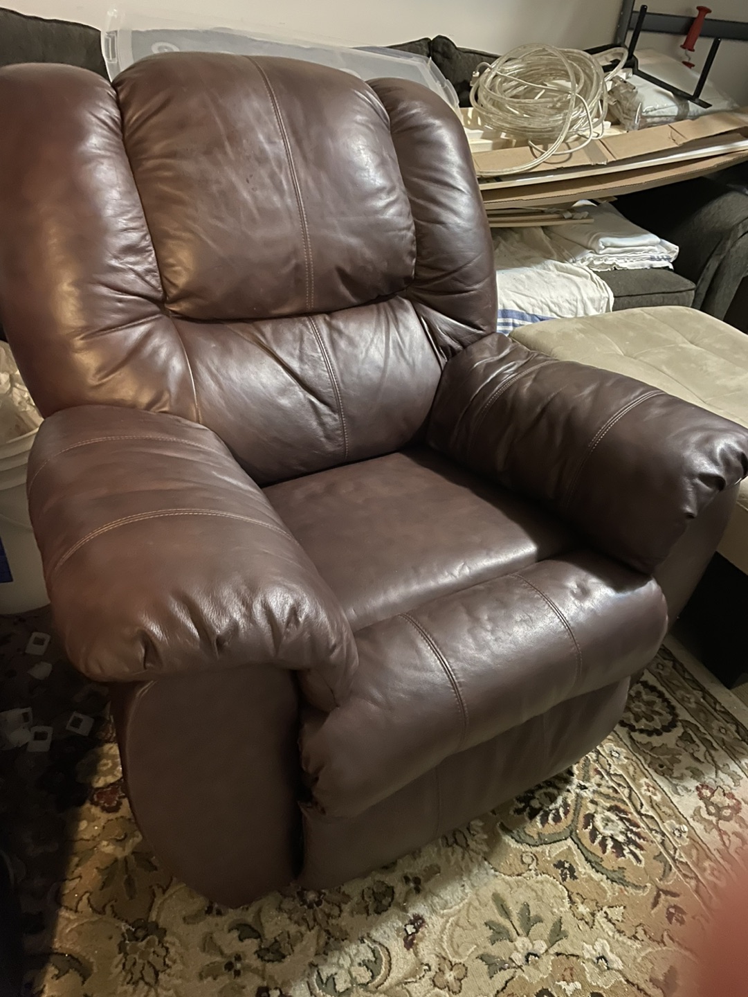 5As is Used Ashley Reclining Genuine Leather Chair/only damaged at bottom right corner/+7yrs/Selling matching Loveseat for $200/will sell all both for $300 (Pick up only)(Cash or E-transfer)