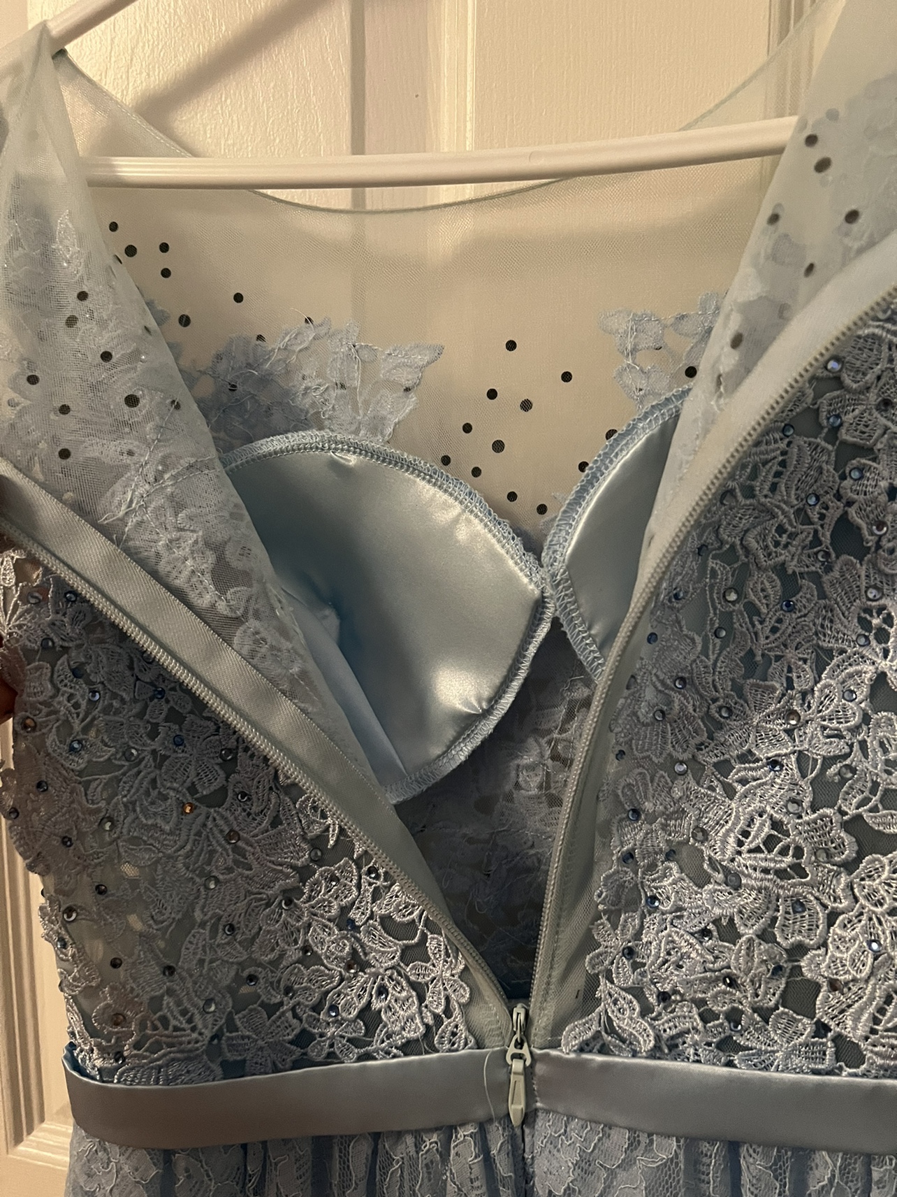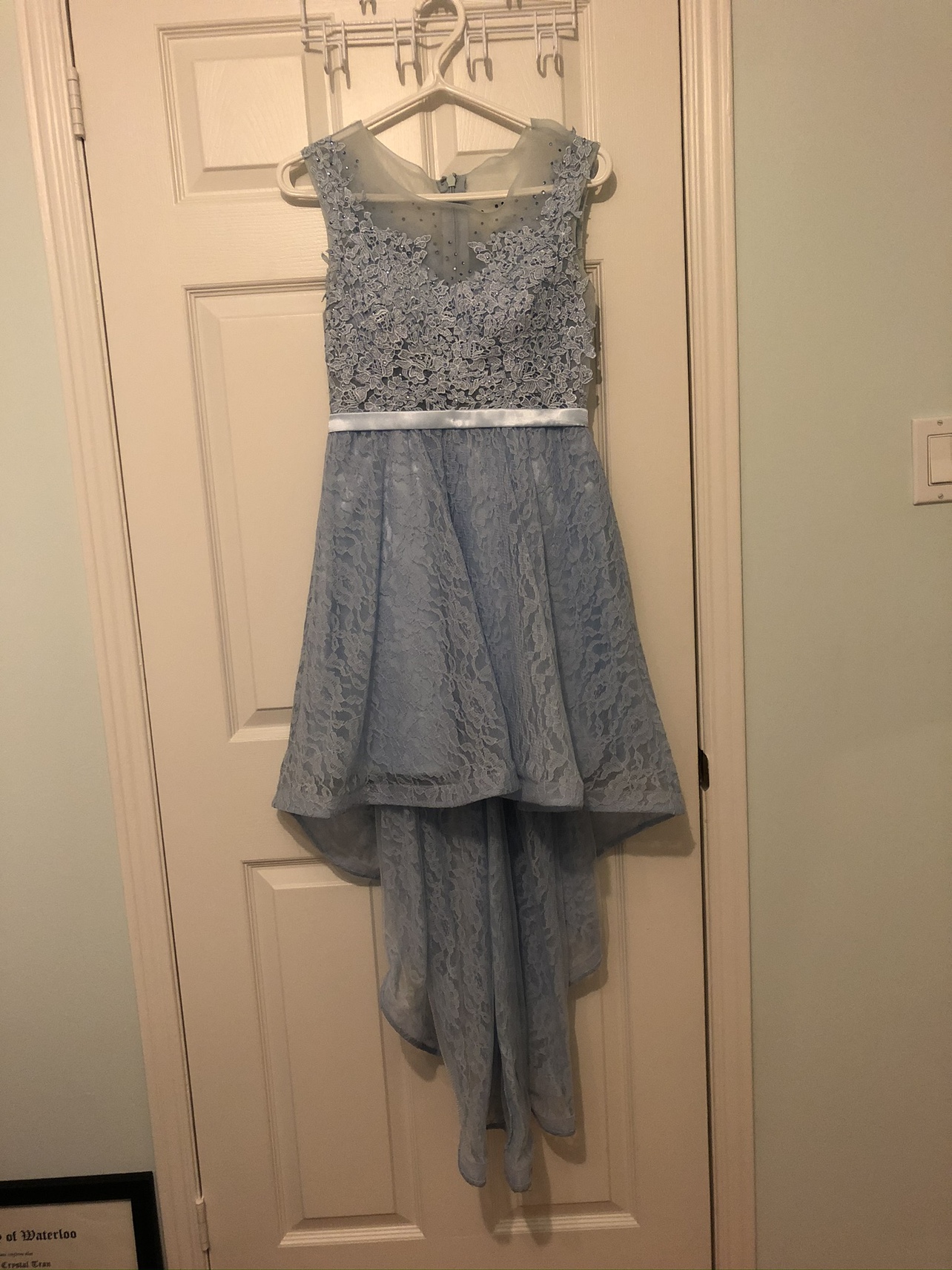 This dress is a beautiful light blue high-low with a lace bodice and a sheer back. It has a satin ribbon belt and is perfect for prom or other special occasion.