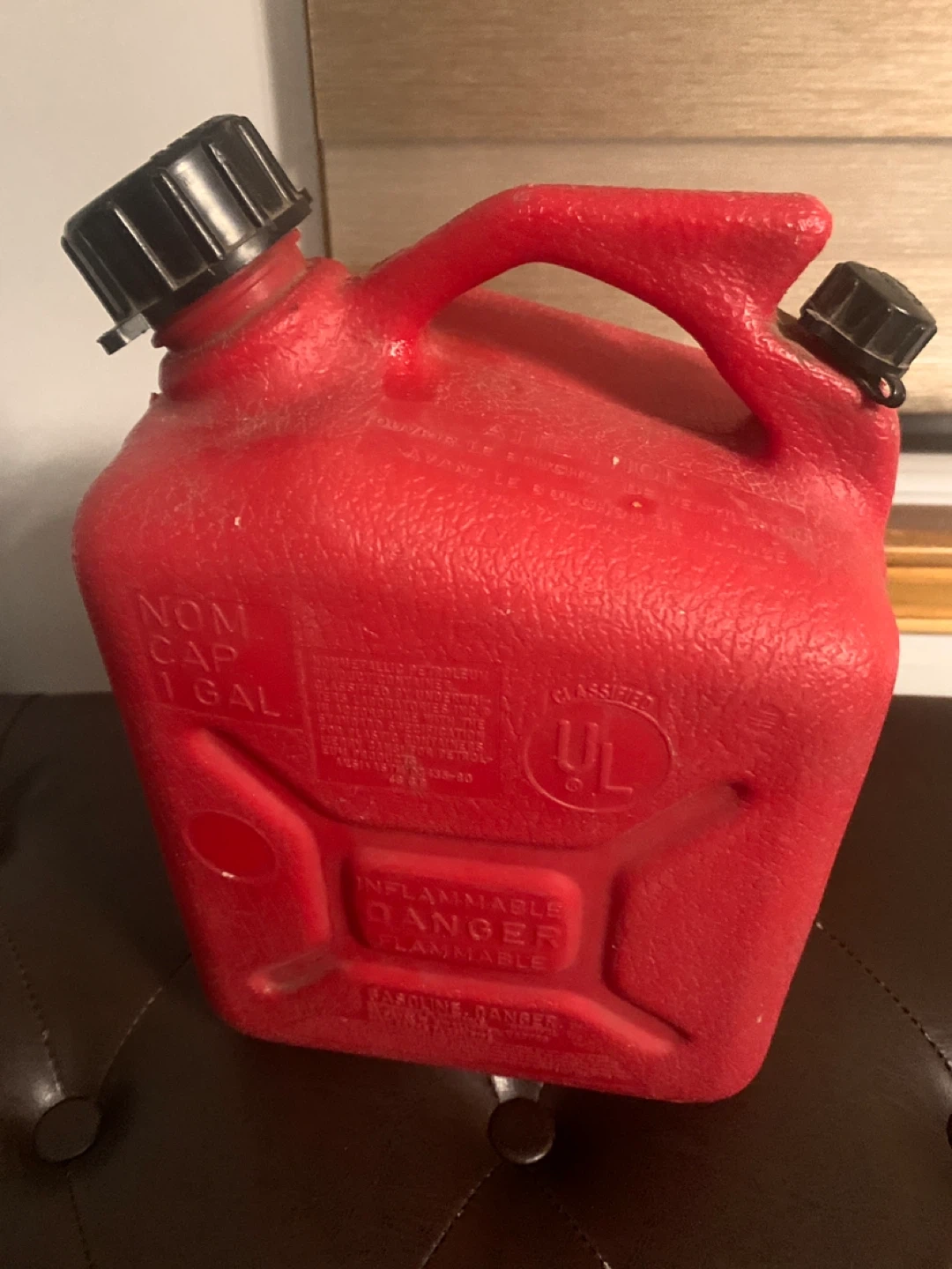 Selling a red 1 gallon gas can. It's in good condition and ready to use for your lawnmower or other equipment. The can is marked with 'INFLAMMABLE DANGER'.