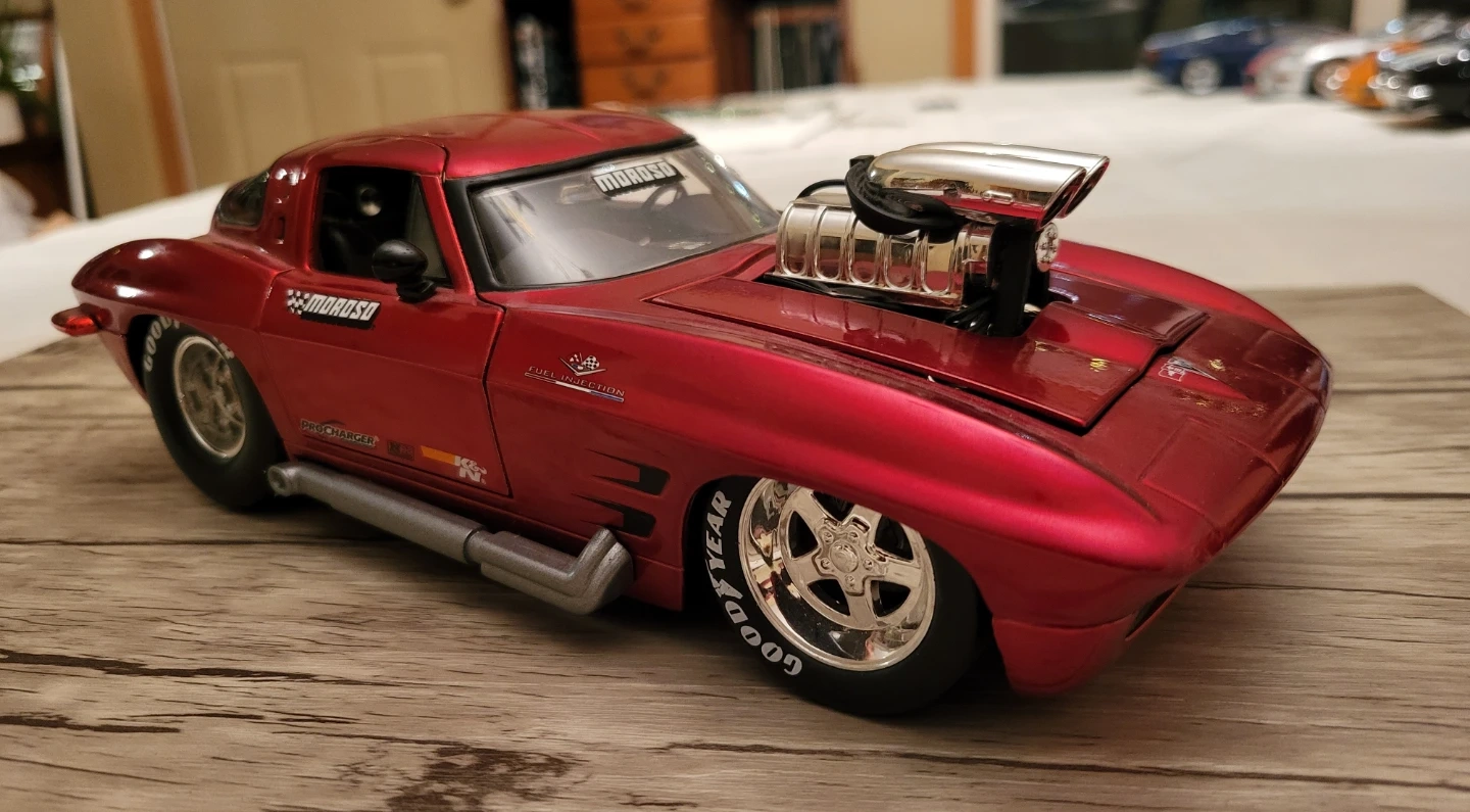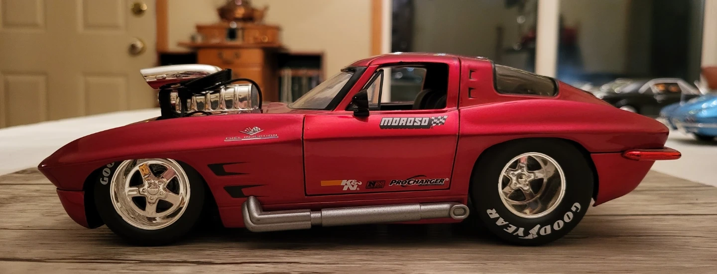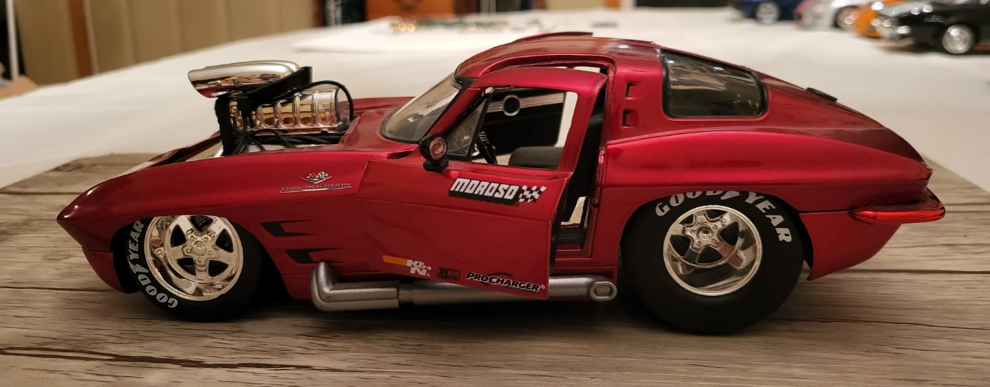 134Selling a sweet-looking red 1963 Corvette Stingray Coupe Pro Street diecast model car! It's got a Moroso logo and Goodyear tires, making it a cool addition to any collection. 1/18 scale, no box. PU on Worthington off St Annes .