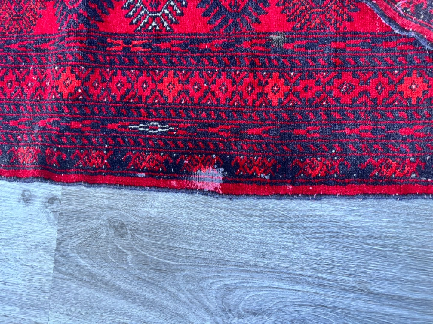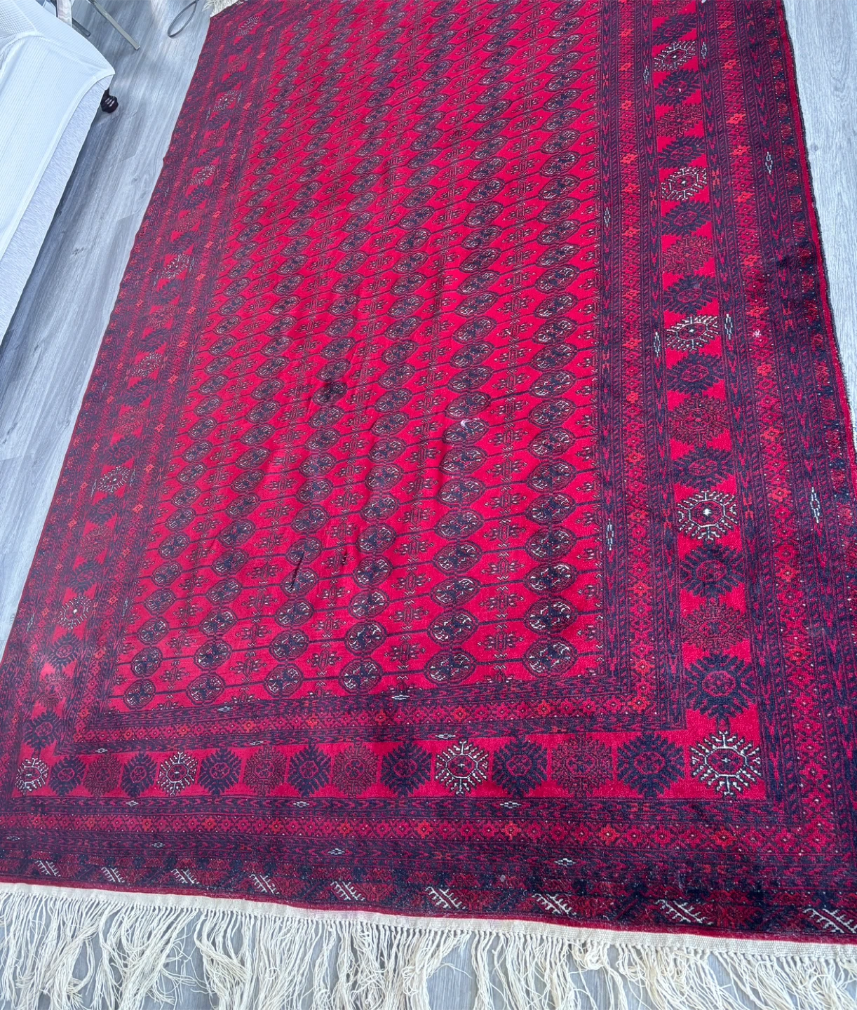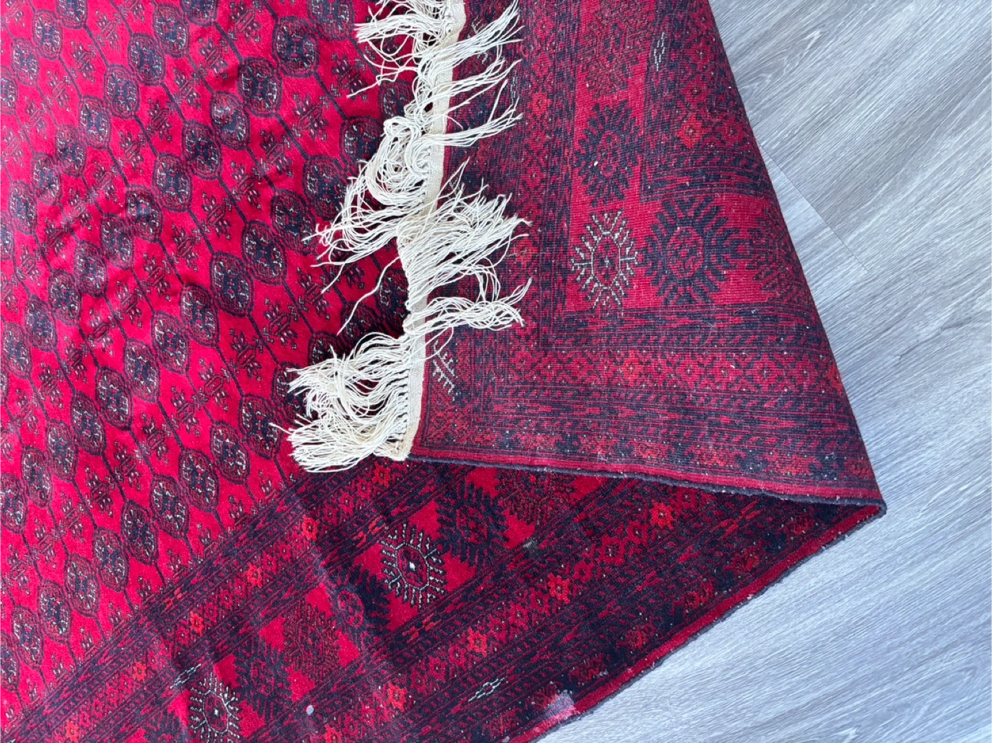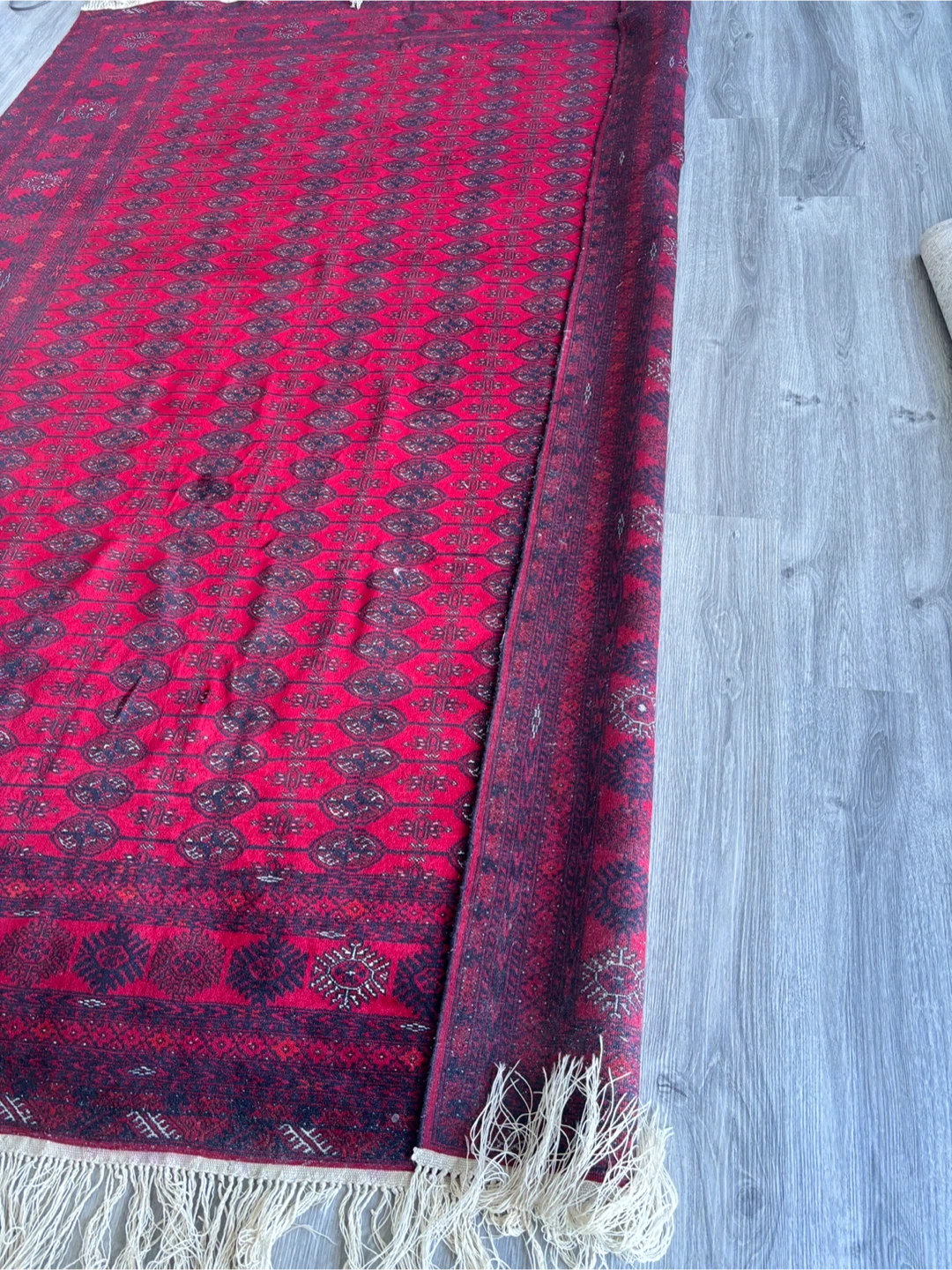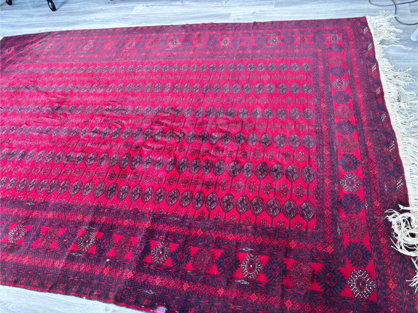 Beautiful red Afghan rug with intricate patterns and a fringed edge. It's a great piece to add warmth and character to any room. There are some signs of wear, but it's in overall good condition