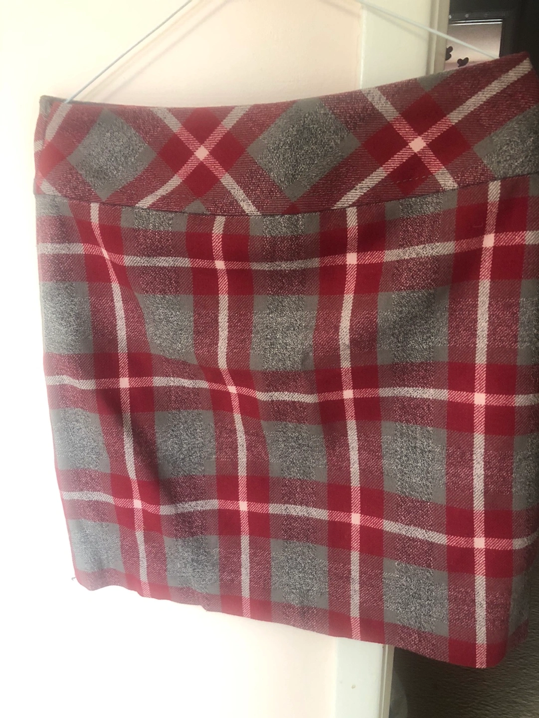 Women's mini skirt. Red, grey and white plaid pattern. Straight cut. Looks cozy.