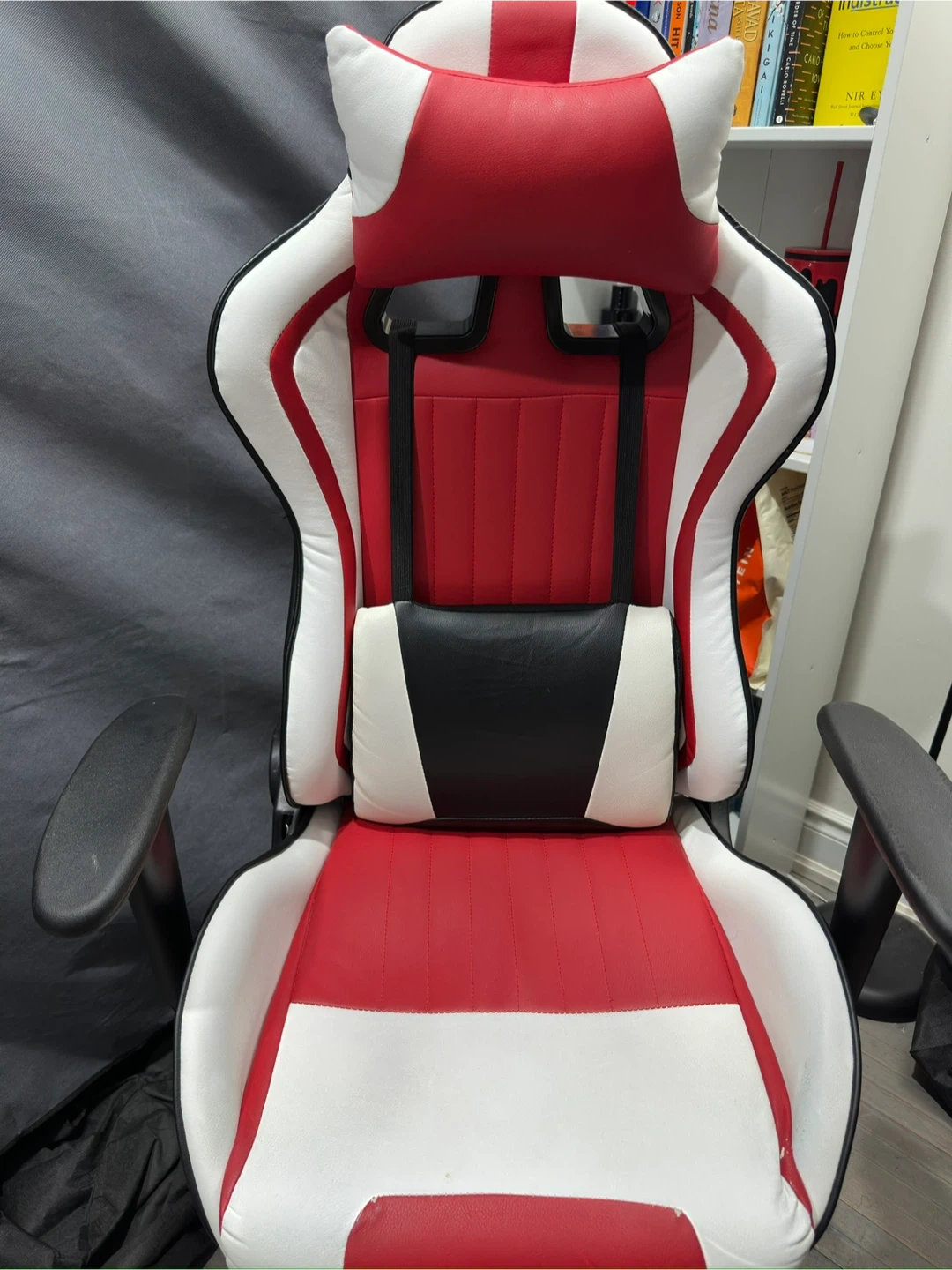 15๐จ MOVE OUT SALE Red & White Gaming / Office Chair ๐ช Selling a comfortable gaming/office chair in pretty good condition. โ Adjustable height โ Recline function โ Includes lumbar support pillow โ Comfortable for long hours โ Minimal wear and tear, well-maintained ๐ Pickup: Dupont & Ossington, Toronto