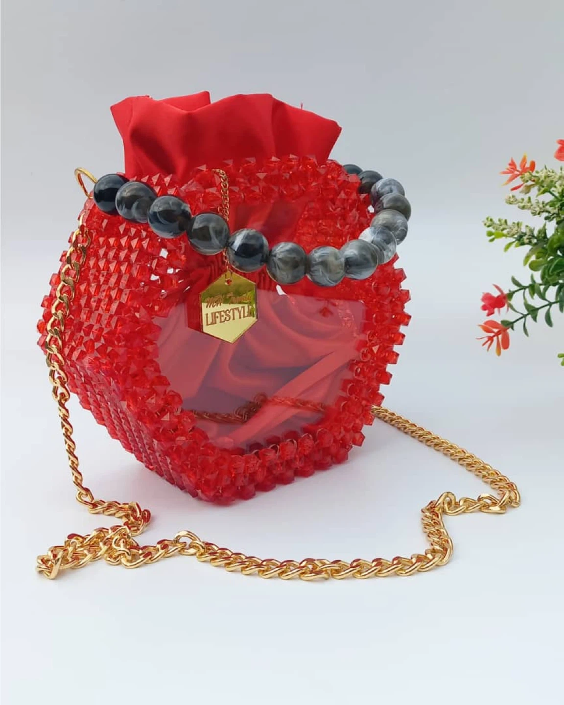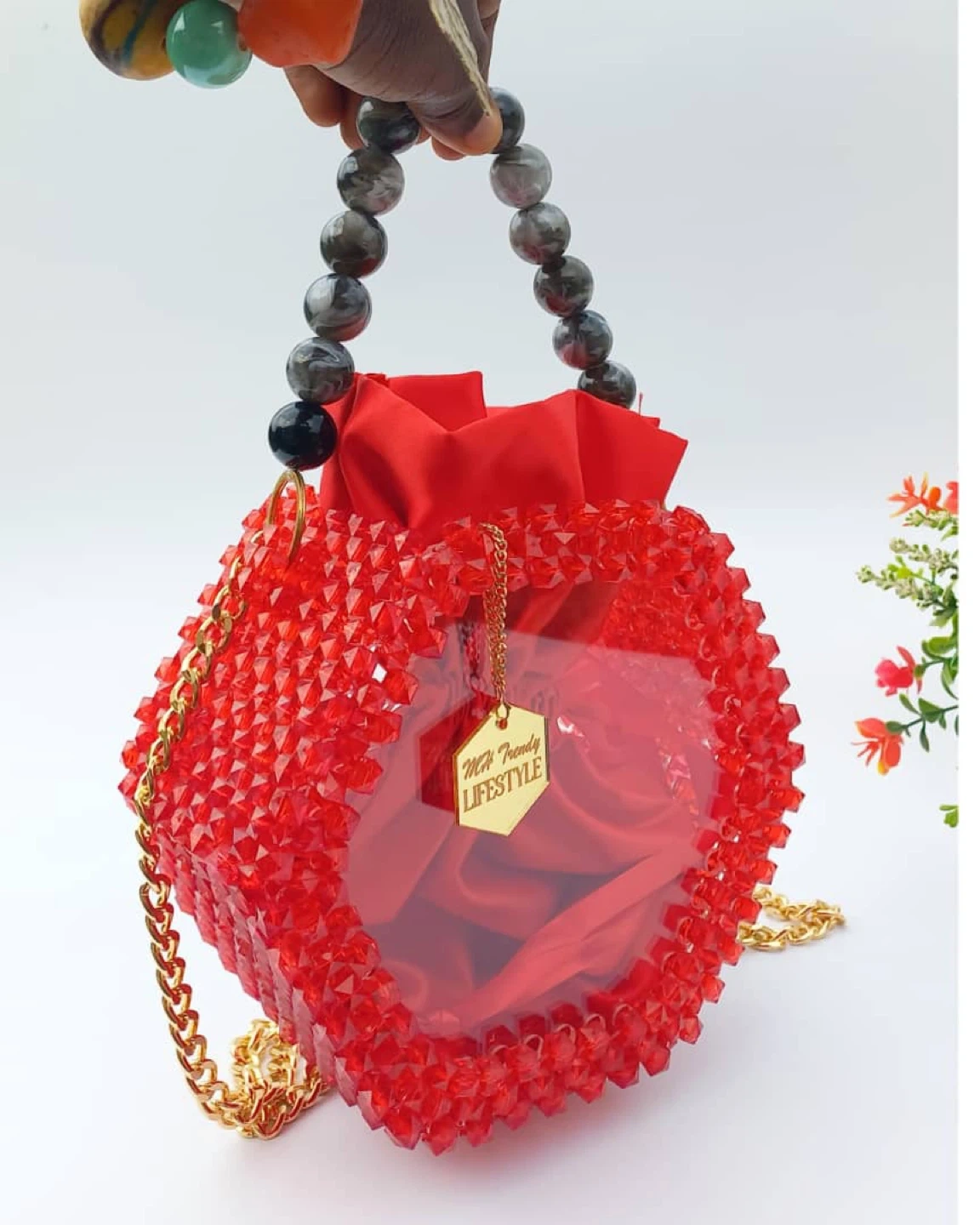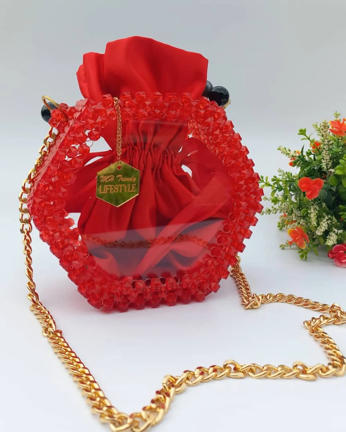 10This is a really unique red beaded bucket bag! It features a drawstring closure with a beaded handle and a gold chain strap. It's a fun and stylish accessory to add a pop of colour to any outfit