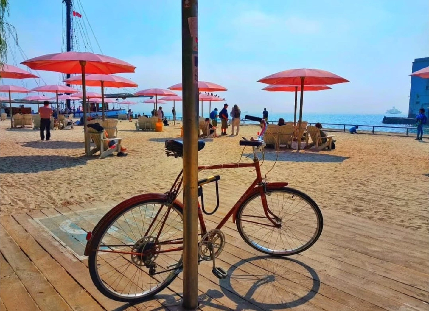 A red bicycle leaning against a pole. Features a seat, handle bars, and wheels. Perfect for a relaxing ride along the boardwalk.