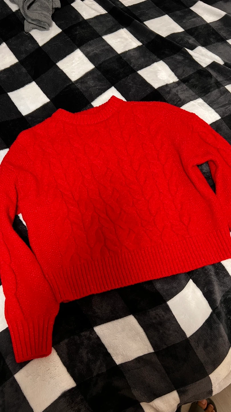 118Cozy red cable knit sweater, perfect for chilly days! It's in great condition and ready for a new home