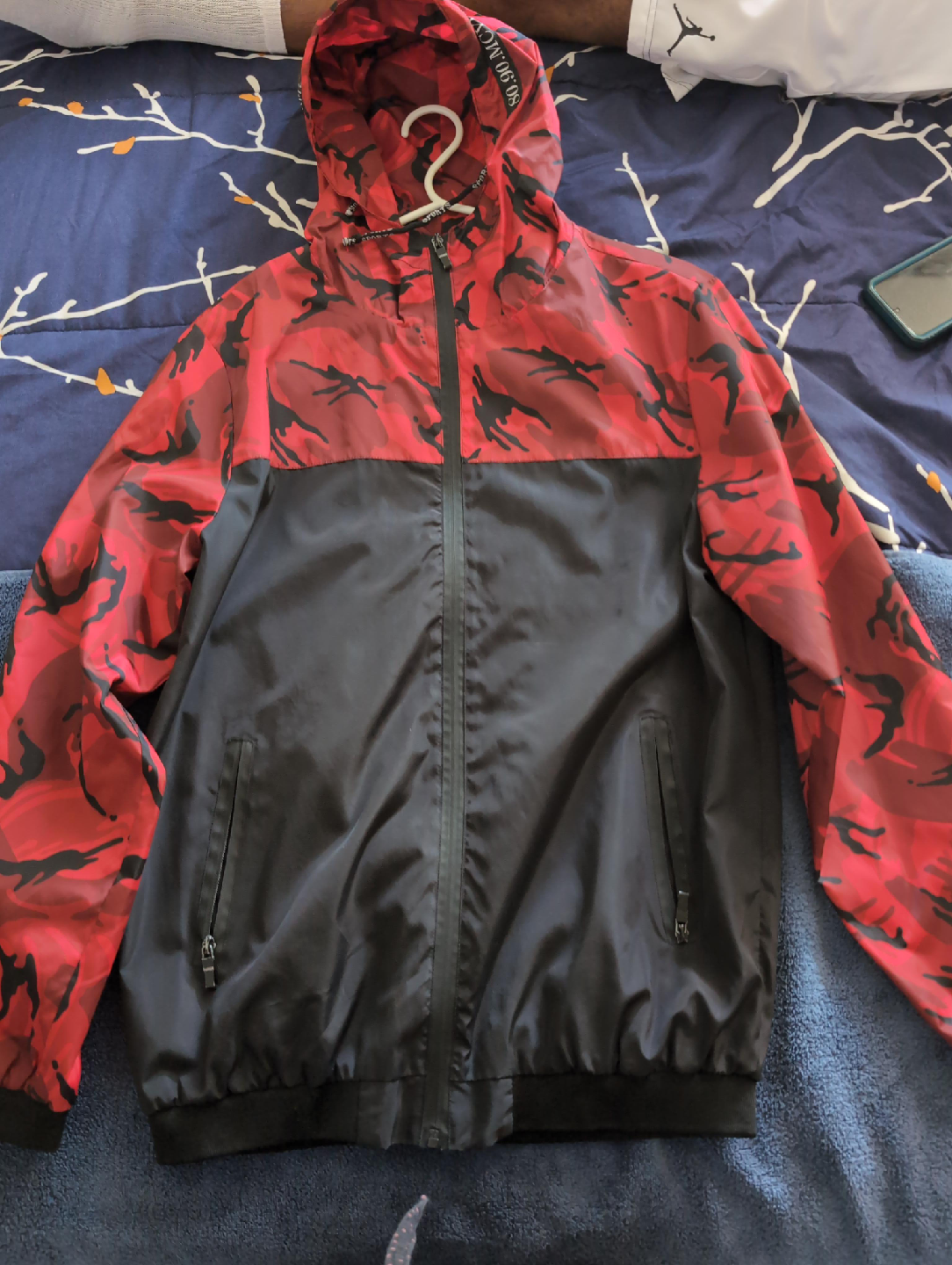 10Stylish jacket with a red camouflage pattern on the upper part and black on the lower part. Great for adding a pop of colour to your wardrobe!