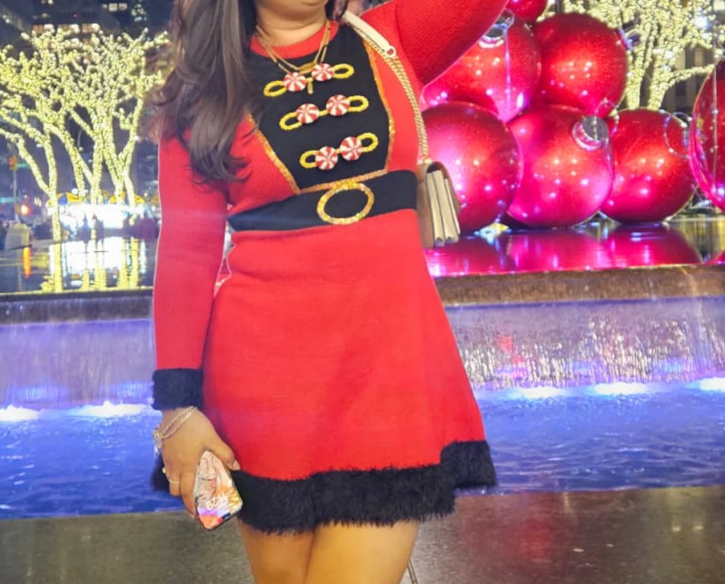 10Selling a festive red Christmas dress! It features black fur trim and decorative candy cane accents. Perfect for holiday parties or a fun night out.