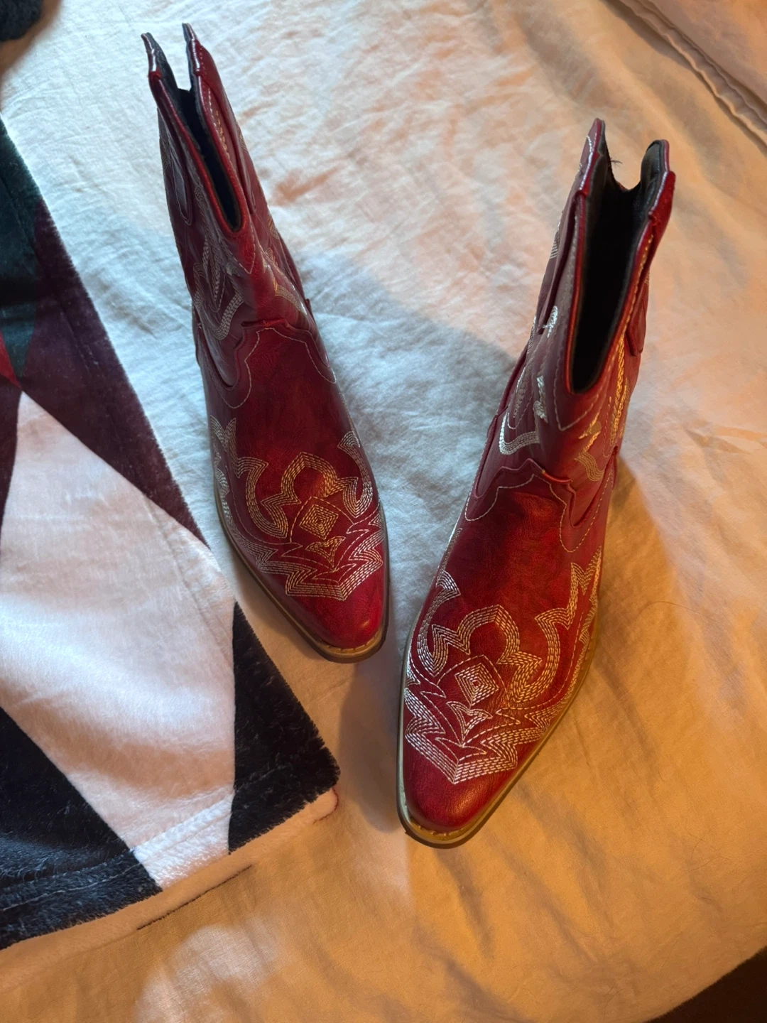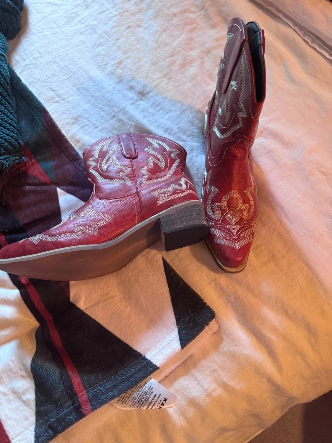 Selling a pair of (not real leather)red cowboy boots with silver embroidery! They're in great shape and ready for a new home. These boots are perfect for adding a bit of flair to any outfit. They’re a stylish choice for a night out or a casual day
