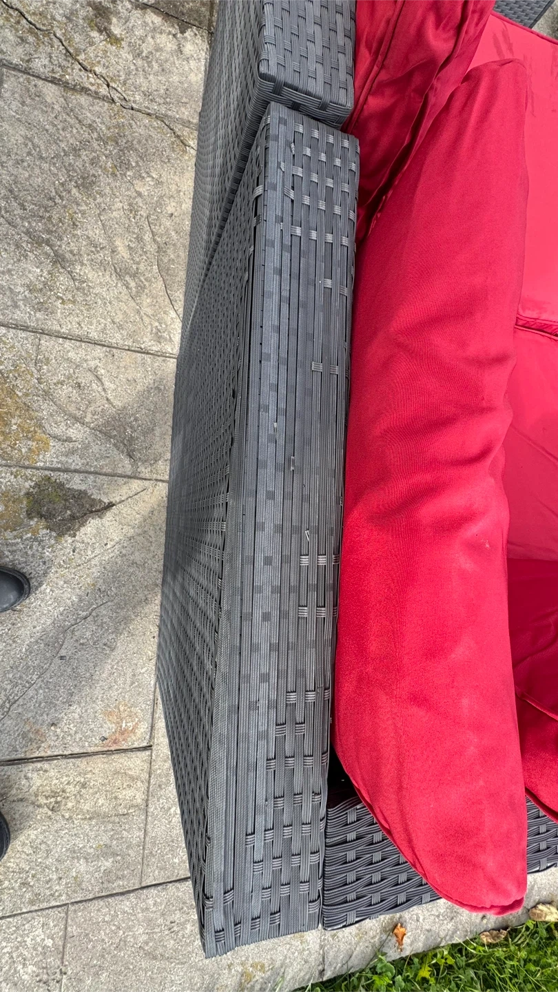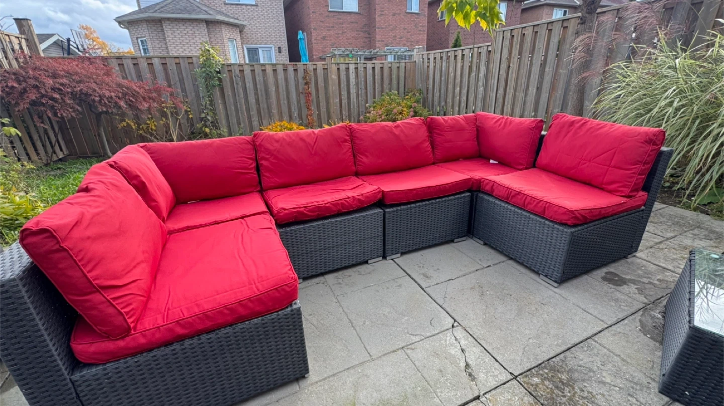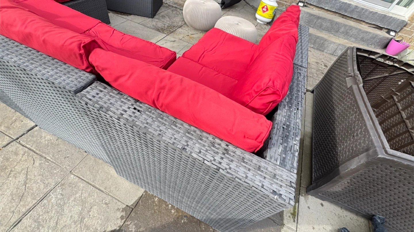 60Selling a comfortable outdoor sectional sofa with red cushions. It's perfect for relaxing in your backyard or on your patio. The sectional pieces can be arranged in different configurations to fit your space. Can seat 5-6 people comfortably. It features a wicker base and plush cushions. A little wear and tear as seen in pictures.