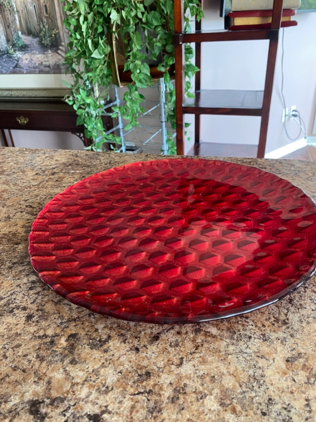 10A beautiful red decorative glass plate for your home! It has a textured pattern and would look great as a centrepiece or accent piece on a table or shelf