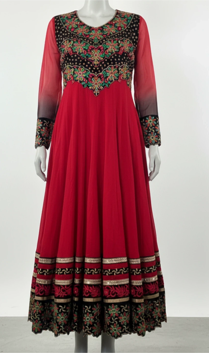 56Beautiful red Anarkali dress with intricate embroidery. The dress features a flowing silhouette and detailed embellishments on the bodice, sleeves, and hem. Perfect for a special occasion! Size small