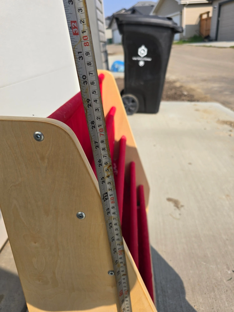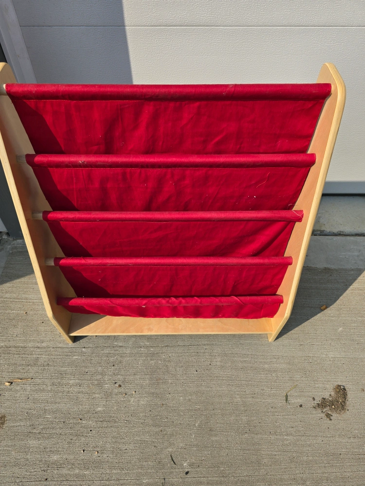 Here's a nice bookcase with red fabric shelves! It's in great shape and ready for a new home. The bookcase measures about 29 inches tall and 12 inches wide. I have 2 available. Kids have out grown these and I need them out of my garage.