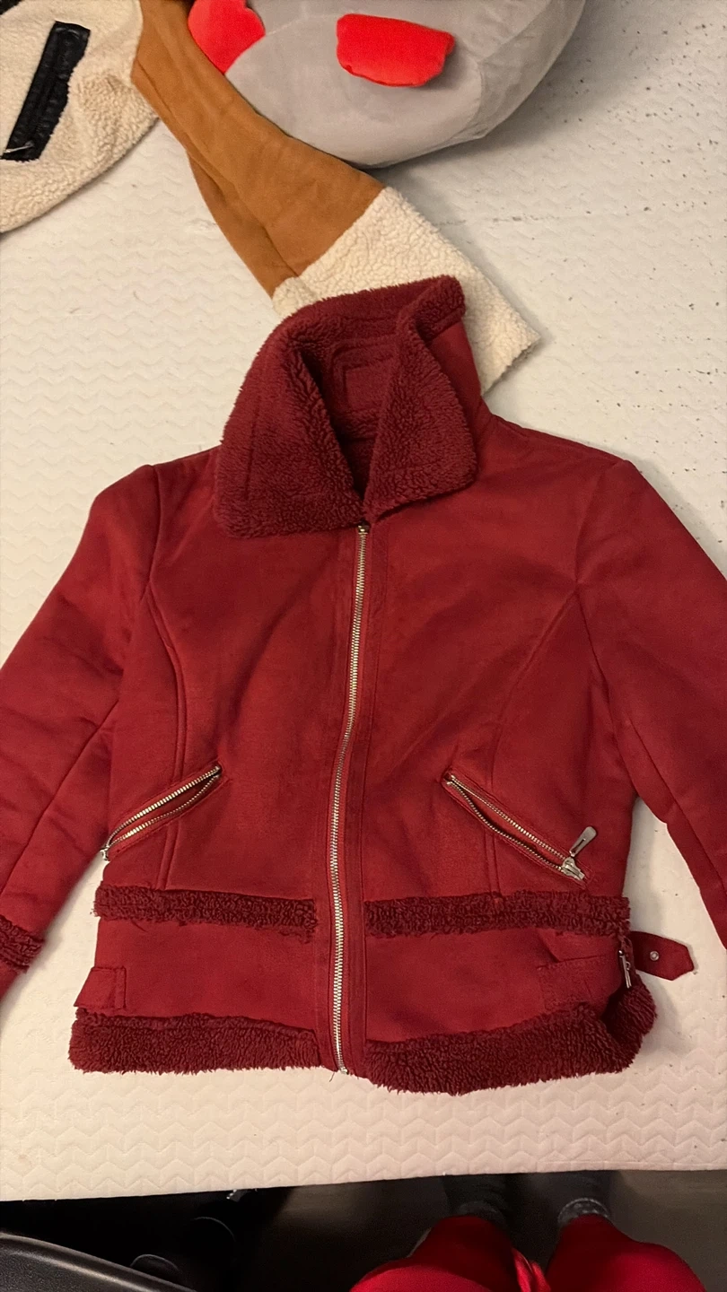 26Selling a stylish red jacket made of faux suede with a cozy fur trim. It features a zipper closure and functional pockets with zipper details. A great addition to any wardrobe for a pop of colour and warmth!