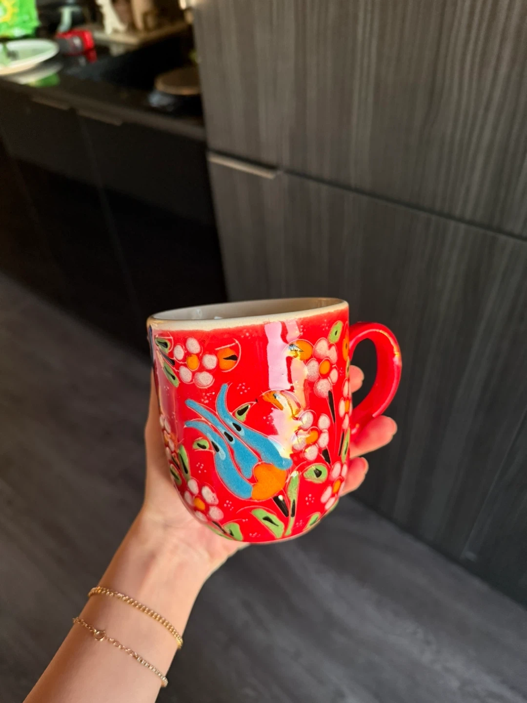 Selling a lovely red ceramic mug with a vibrant floral design! It's perfect for adding a pop of colour to your morning coffee or tea routine. The mug is in great condition and ready for a new home