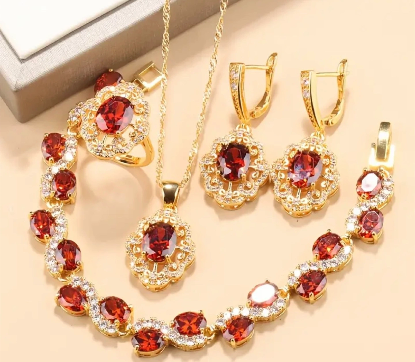 Beautiful gold-plated jewellery set featuring red gemstones. Includes a necklace, earrings, bracelet, and ring. Perfect for adding a touch of elegance to any outfit!