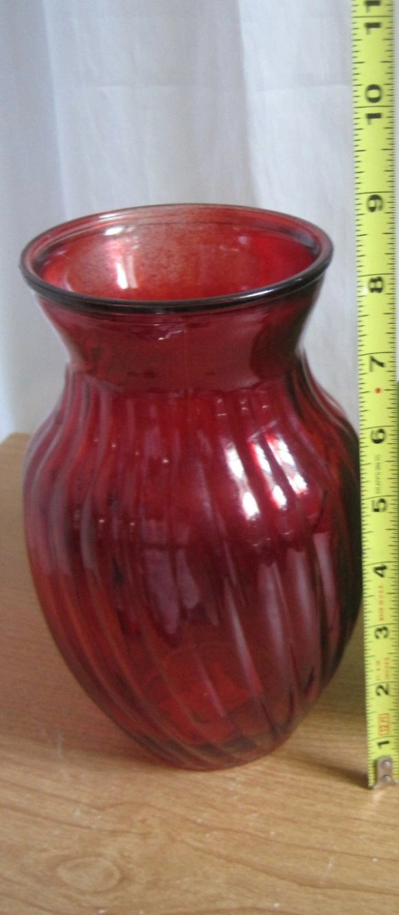 1000+*Pick up ONLY at location shown on ad. NO delivery. Here's a lovely red glass vase! It has a nice, classic shape and would look great with flowers or on its own as a decorative piece. It measures approximately 8 inches tall
