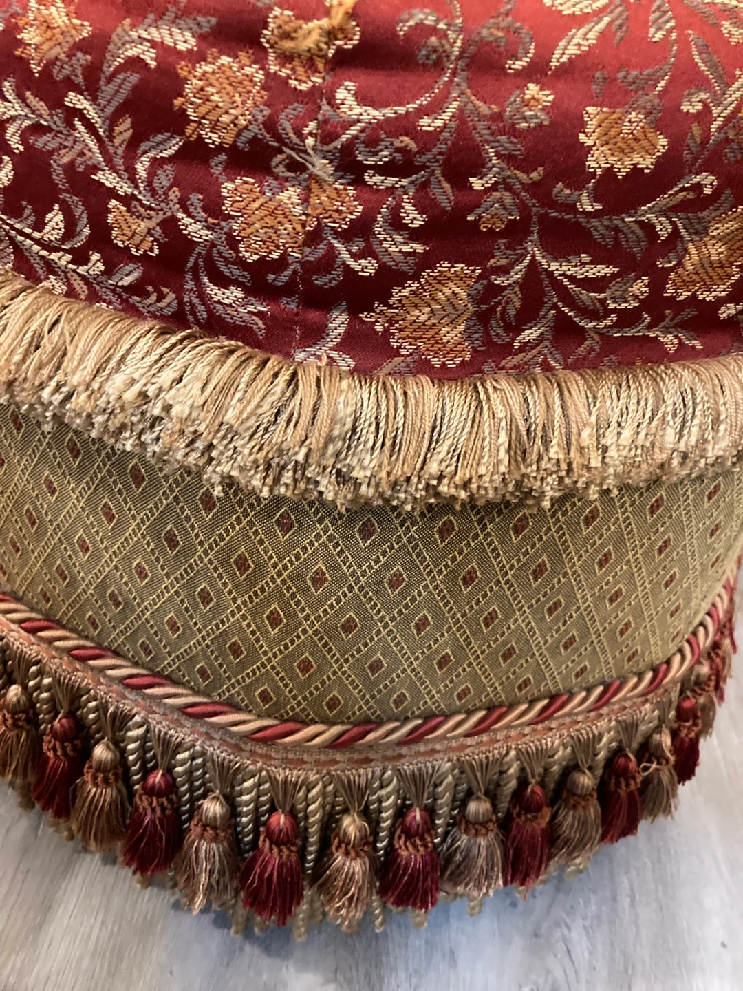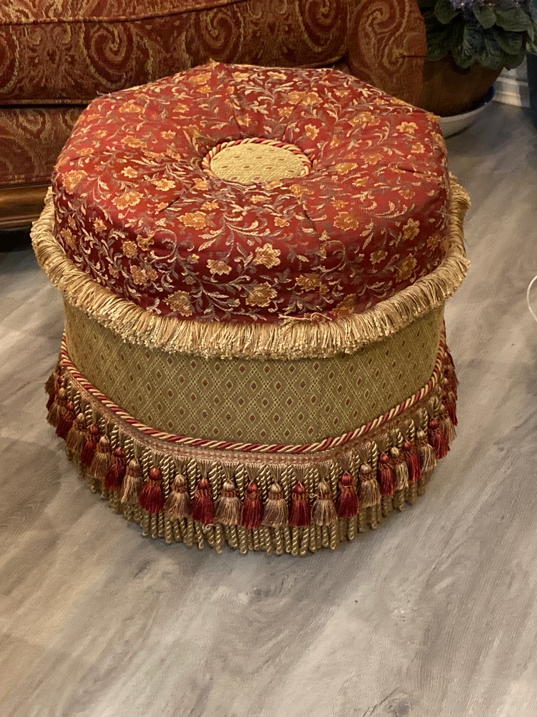 This is a beautiful decorative ottoman or footstool, perfect for adding a touch of elegance to any room! It features a red and gold floral pattern on top, with a decorative fringe trim around the base. It's in great condition and ready for a new home!