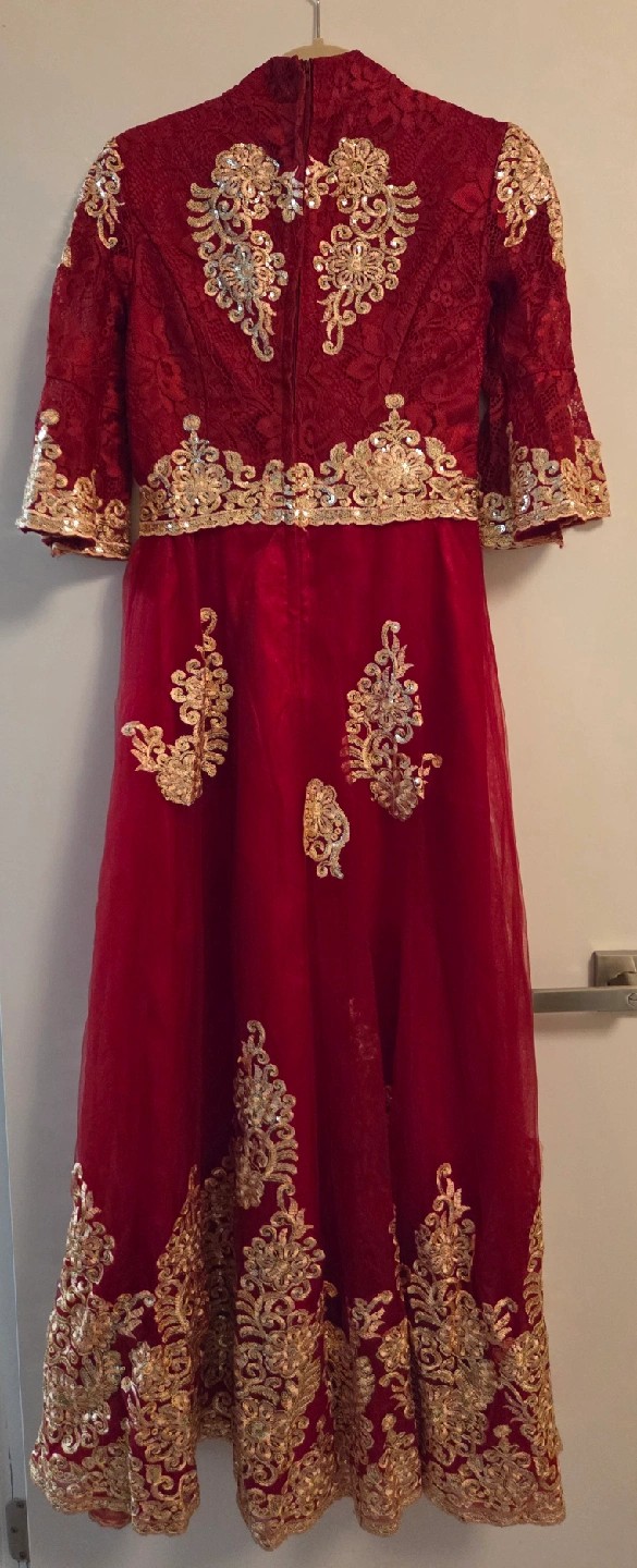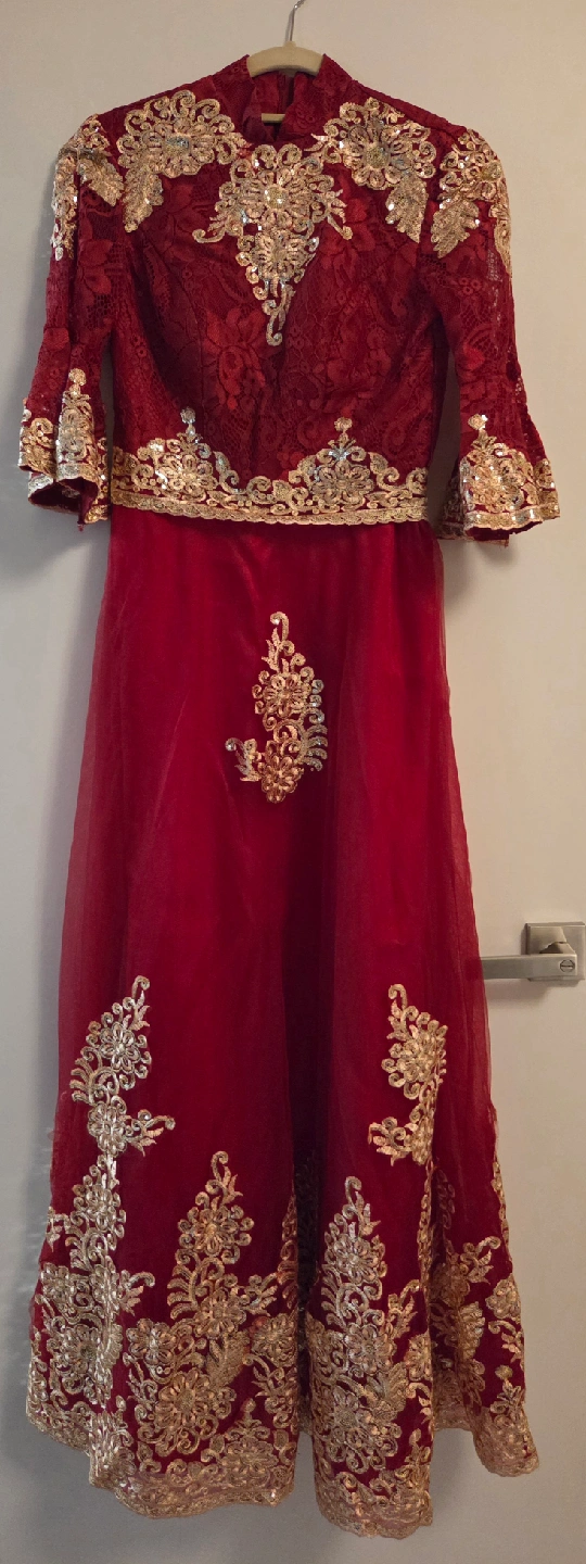 Beautiful red dress with gold embellishments, perfect for a special occasion! The dress features a unique design with intricate detailing. It's in great condition and ready for a new home
