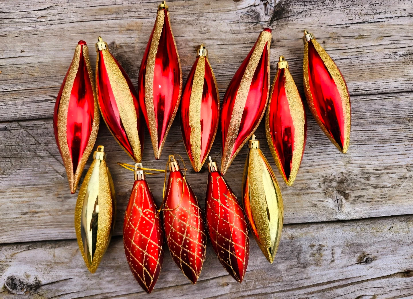 97Red & gold teardrop holiday ornaments. Pick up in Kitchener, $12 for all 12!