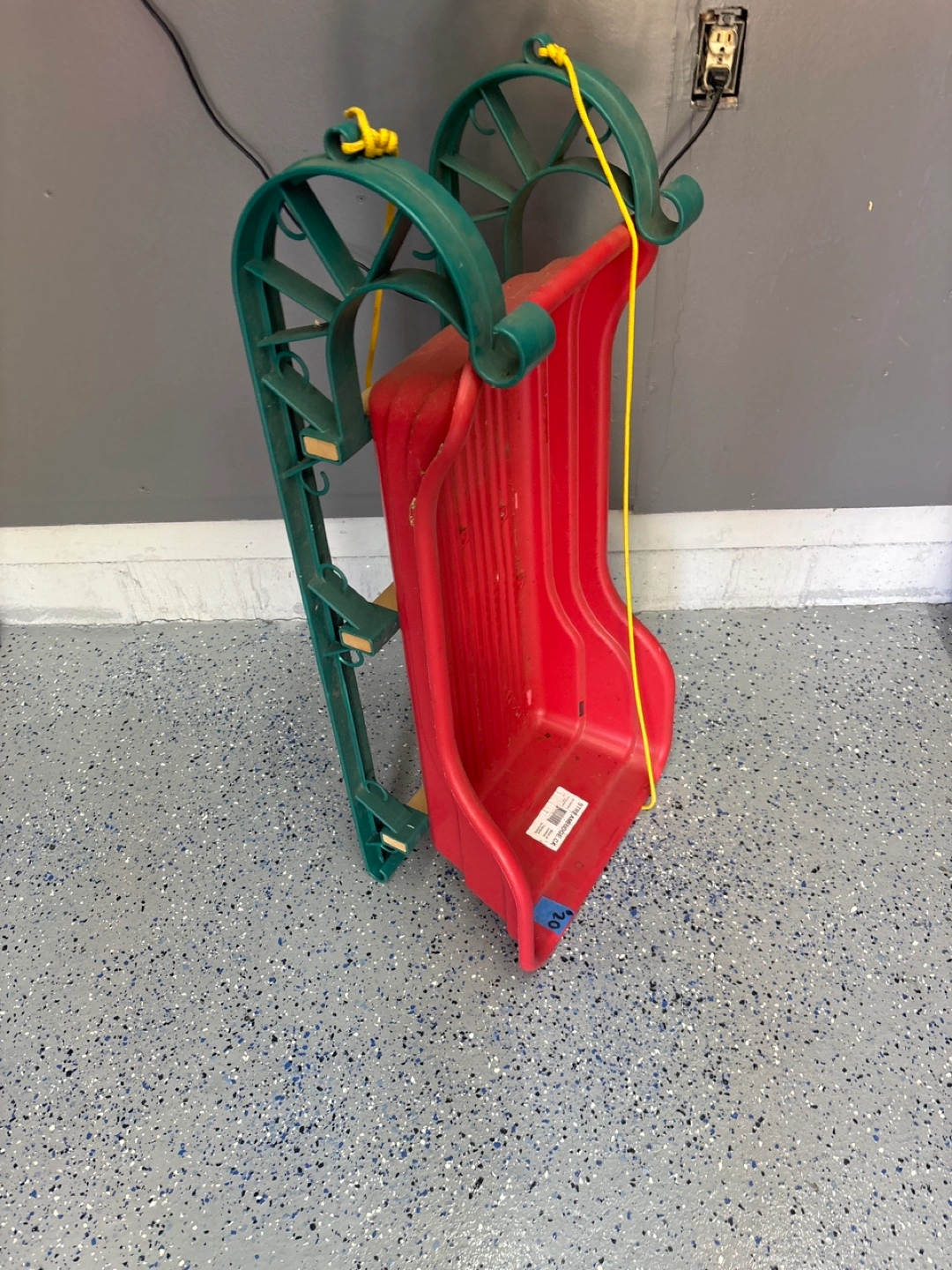 Selling a red and green plastic sled. It looks like it's in good condition and ready for some winter fun!