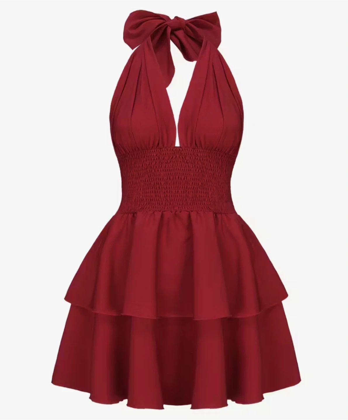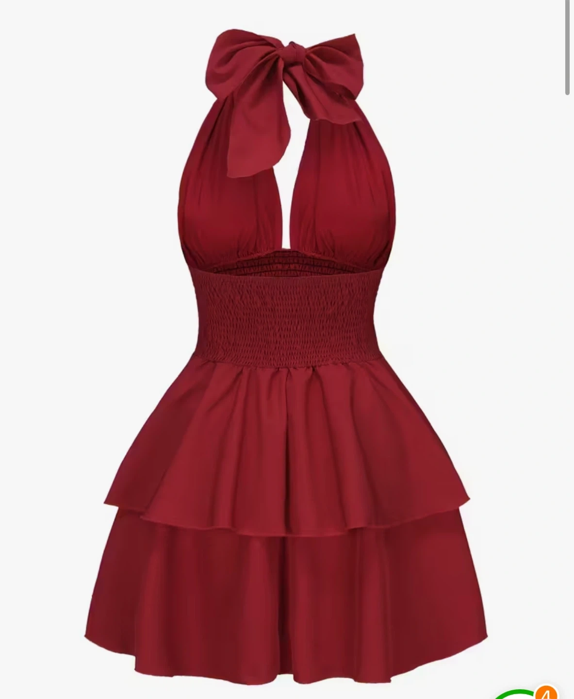 58Selling a cute red halter mini dress! It features a bow at the neck and a tiered skirt. Perfect for a night out or a special occasion
