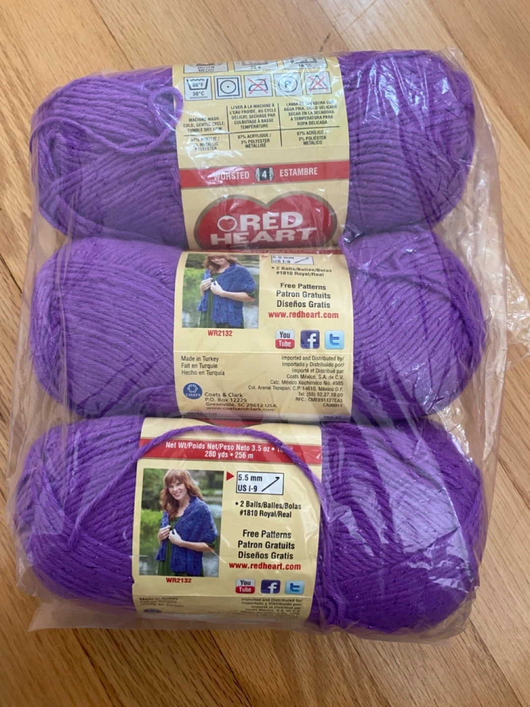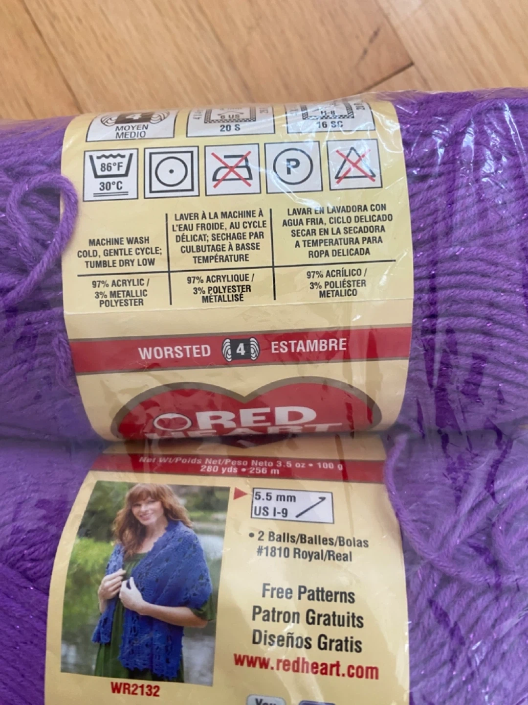 65Three skeins of Red Heart Super Saver yarn, in the Royal/Real colour (#1810)! Each skein is 100g / 3.5 oz and 236 meters / 260 yards. It's a worsted weight yarn, made of 97% acrylic and 3% metallic polyester. Machine washable and tumble dry low. Great for all sorts of projects!