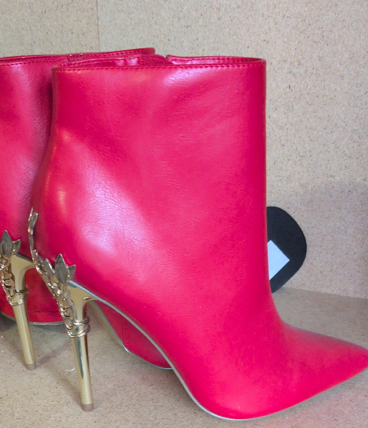 Check out these striking red ankle boots! They feature a unique gold-coloured heel design that's sure to turn heads. They are in excellent condition and ready for a new home!