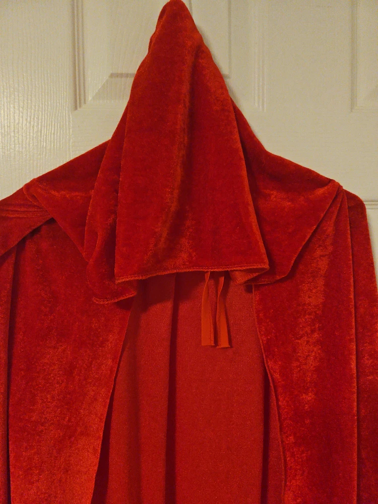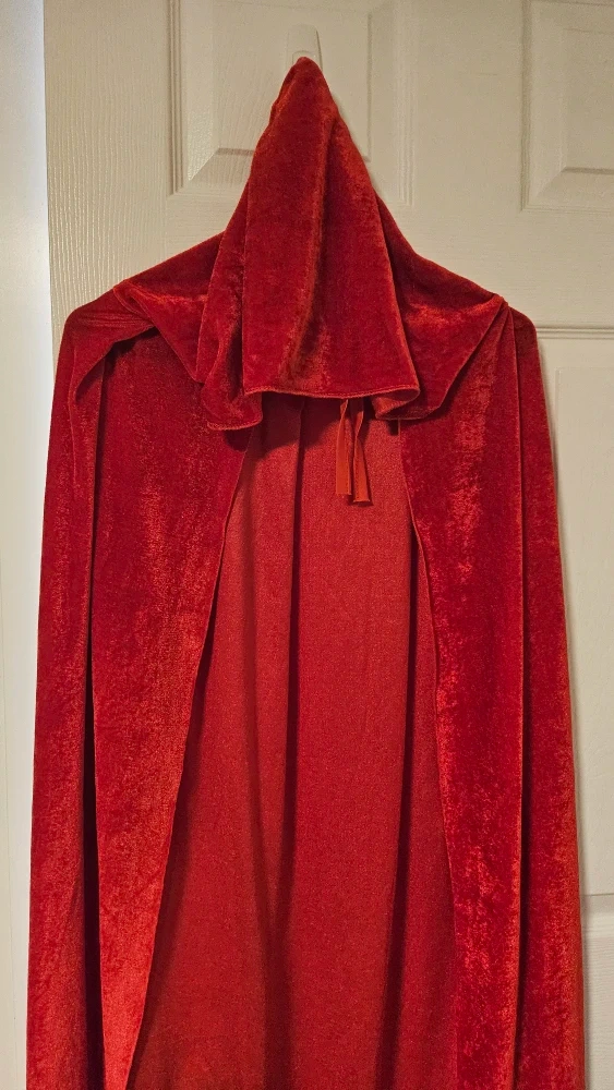 60Here's a red velvet-like hooded cloak! It's perfect for costumes or just adding a bit of flair to your wardrobe. It's in great condition with a comfortable material. Approximately 4 feet in lenght.
