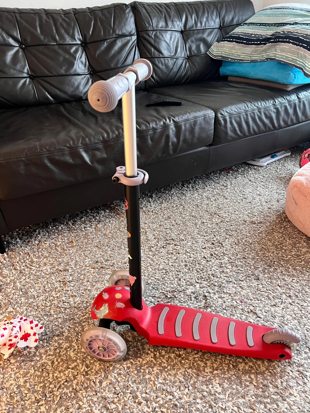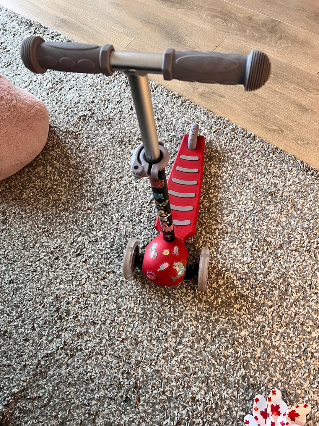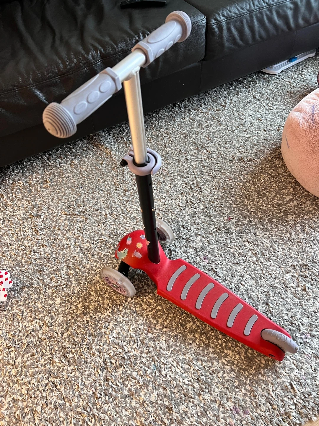 Selling a cute red kids scooter, perfect for little ones learning to scoot around! It’s in good condition and has flashing wheels with three adjustable heights.