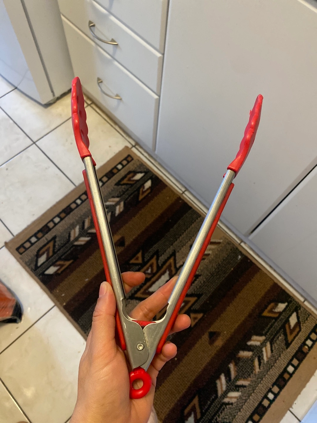 Selling a pair of kitchen tongs with red silicone grips and stainless steel arms. They're in great shape and ready to help with your cooking needs