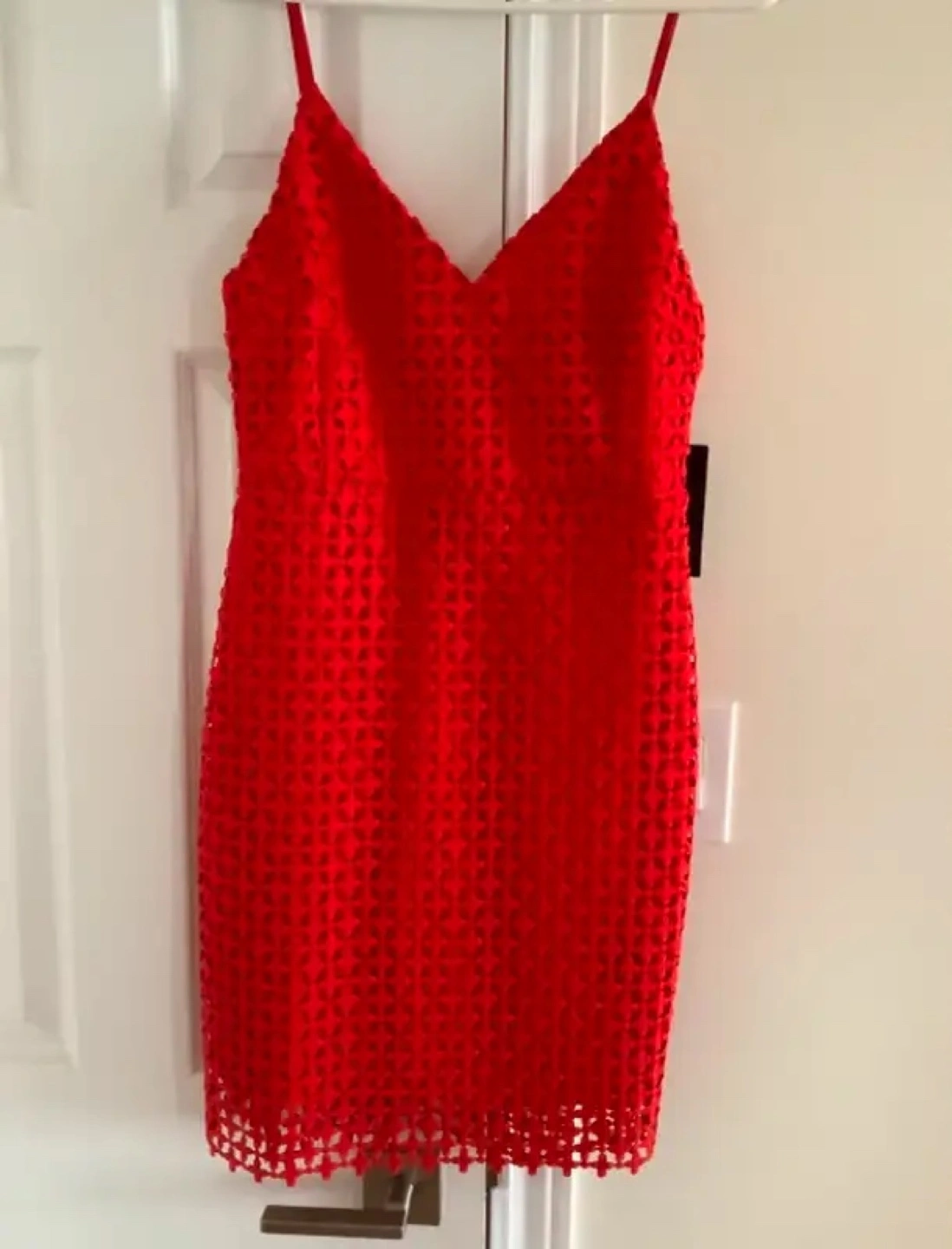 28Red, sleeveless, lace dress. Perfect for any occasion. Has a V-neckline and a fitted silhouette. Medium size - not loose fit. For a 5’7” person the dress is 6’ inch above the knee. New, still has tag attached. Never worn.