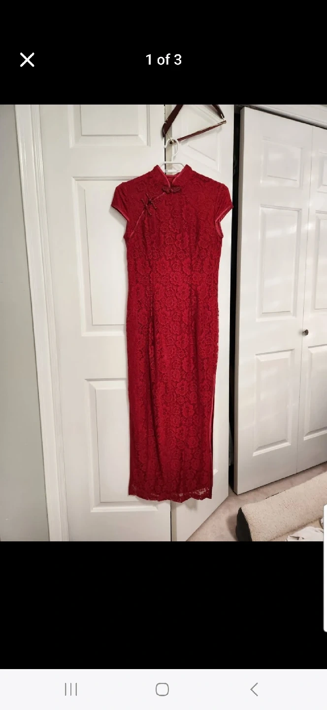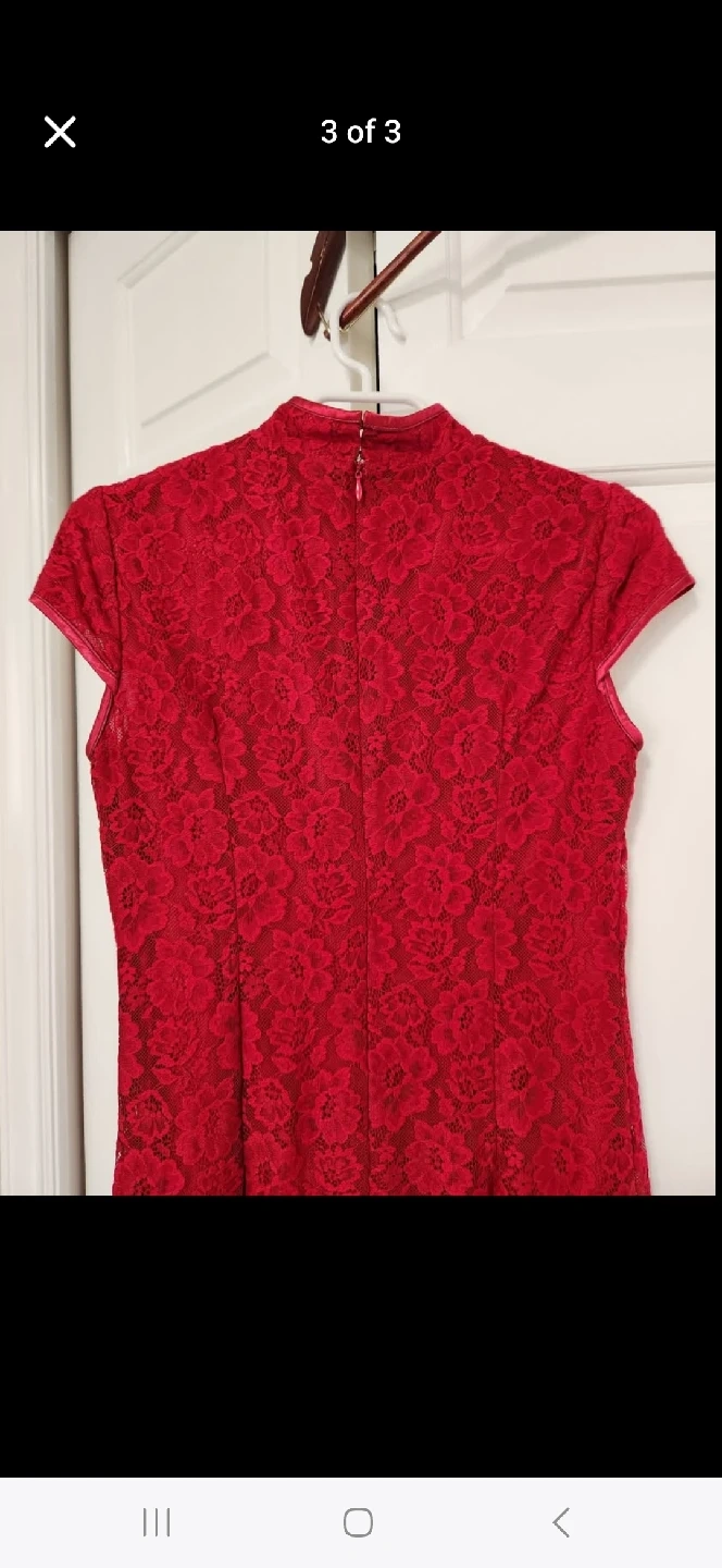 18Women's Chinese Red Evening Dress. 20" Slit on both sides. From Shoulder to bottom edge measures approximately 51" height. across chest measures approximately 15.5" wide. Size similar to a SIZE Small