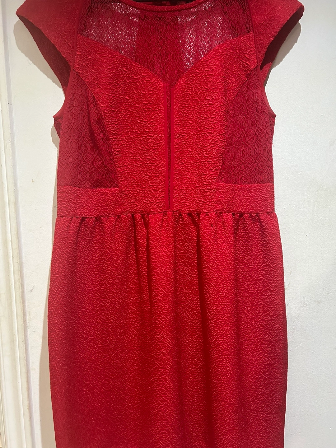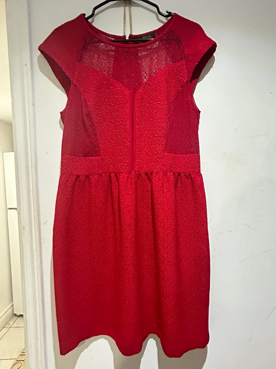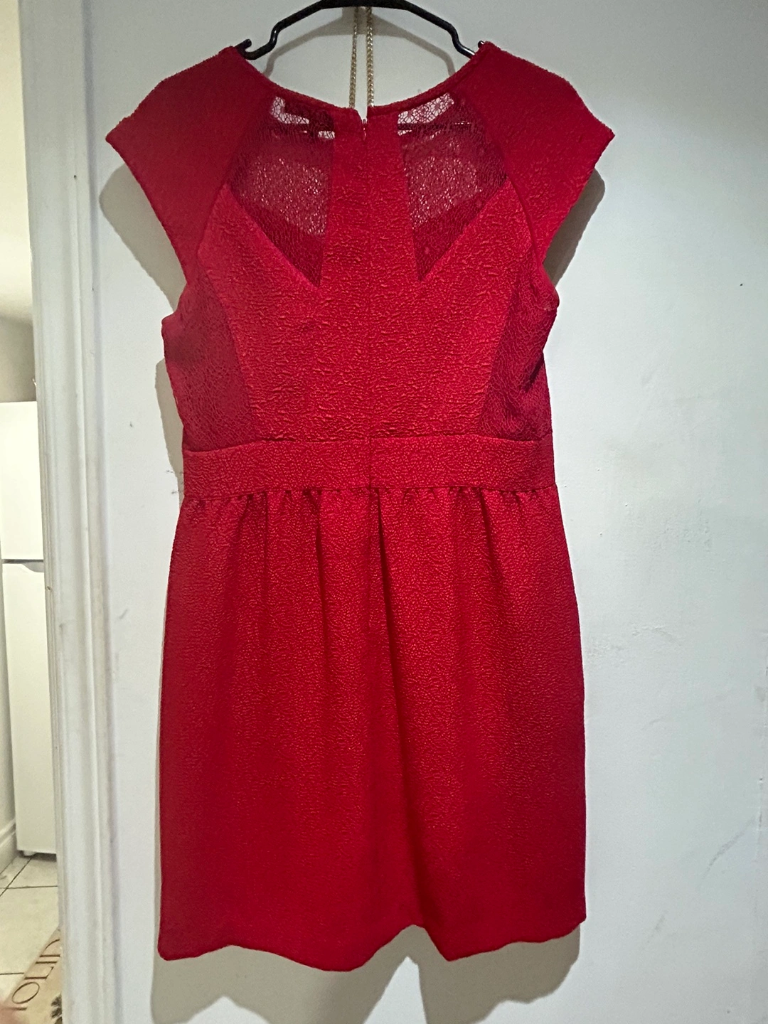 A red dress with a lace insert at the back. The dress is a size medium and is fitted through the waist and flares out to the bottom. The sleeves are cap sleeves. The dress has a zipper closure at the back. The dress is in excellent condition.