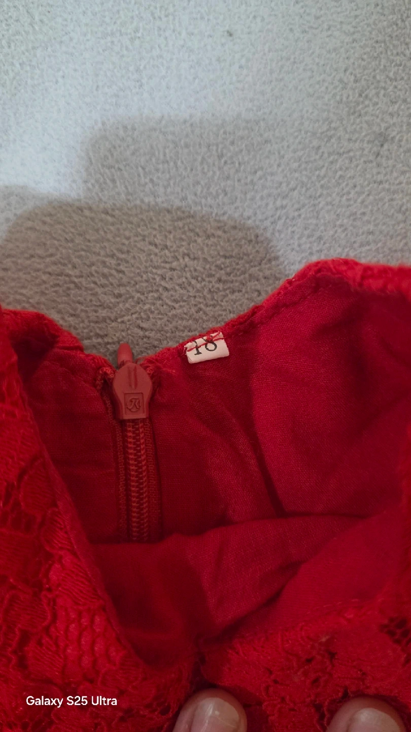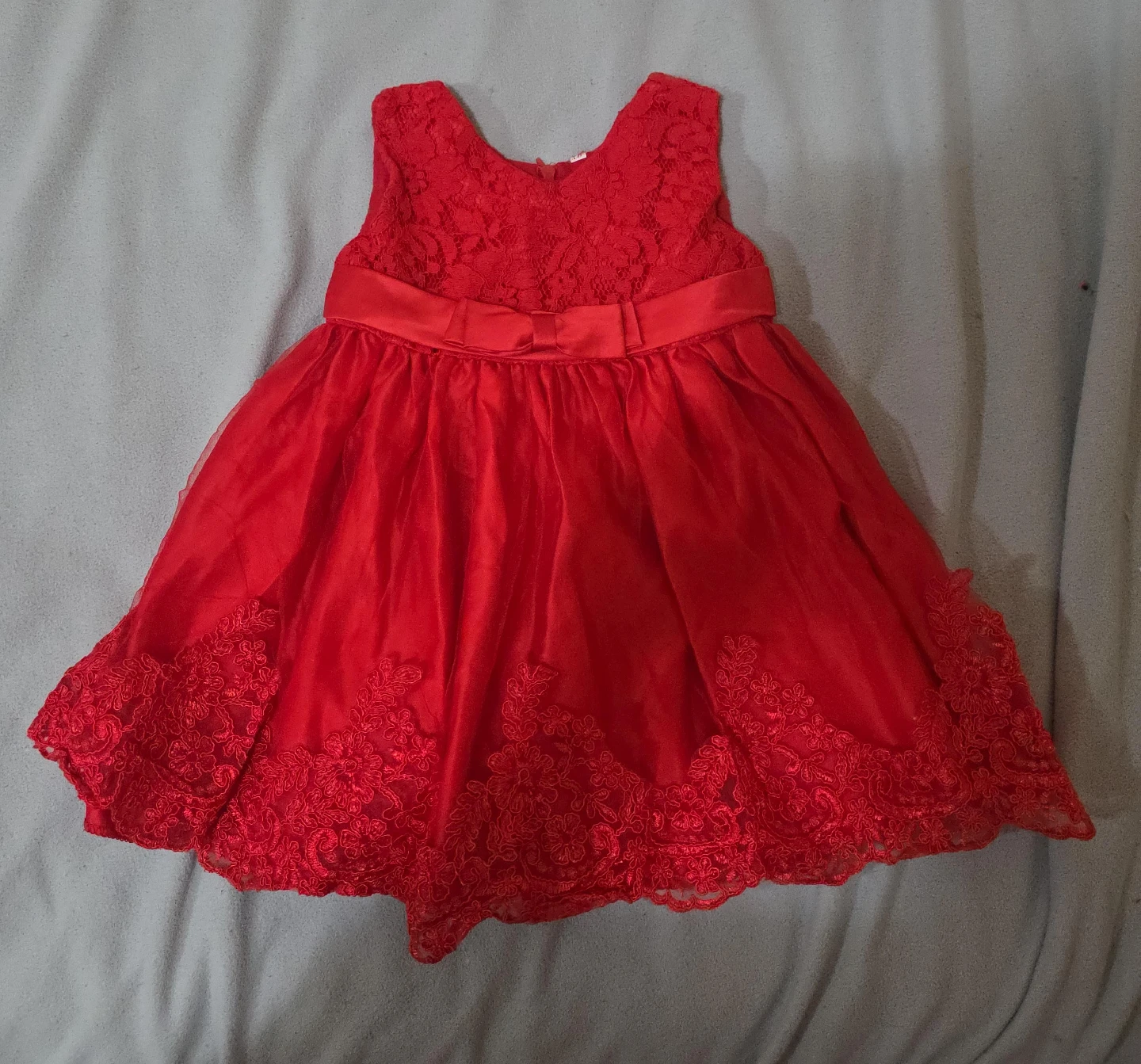 15A beautiful red lace dress for your little one! This dress is in great condition and features delicate lace detailing and a sweet bow at the waist. Perfect for special occasions or just dressing up for fun! Size is 18 months
