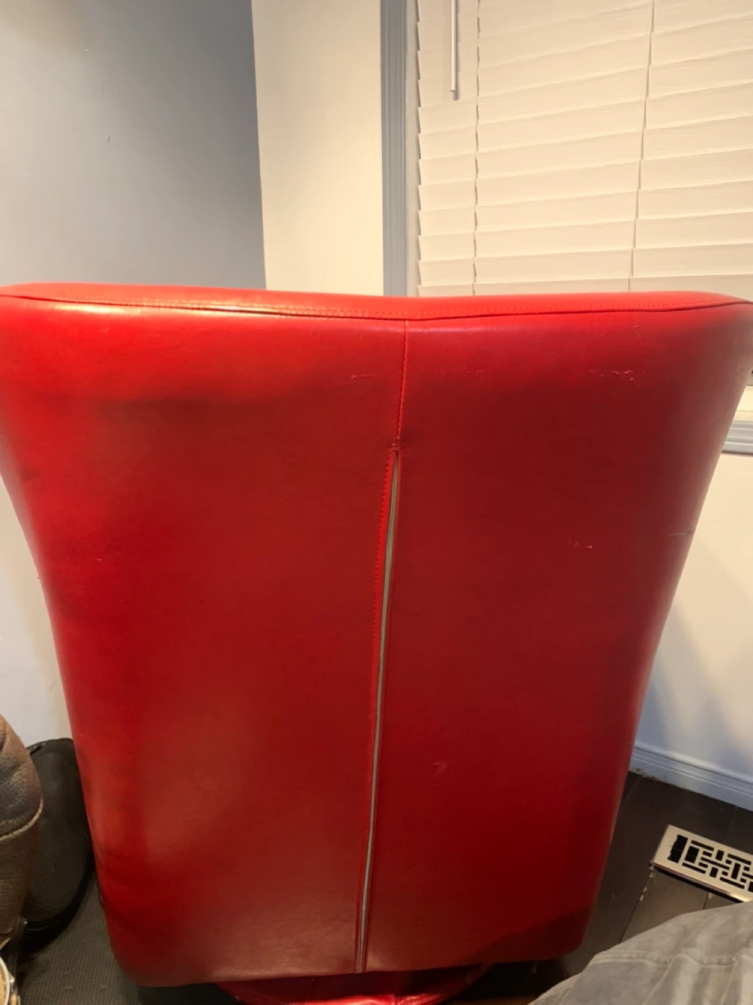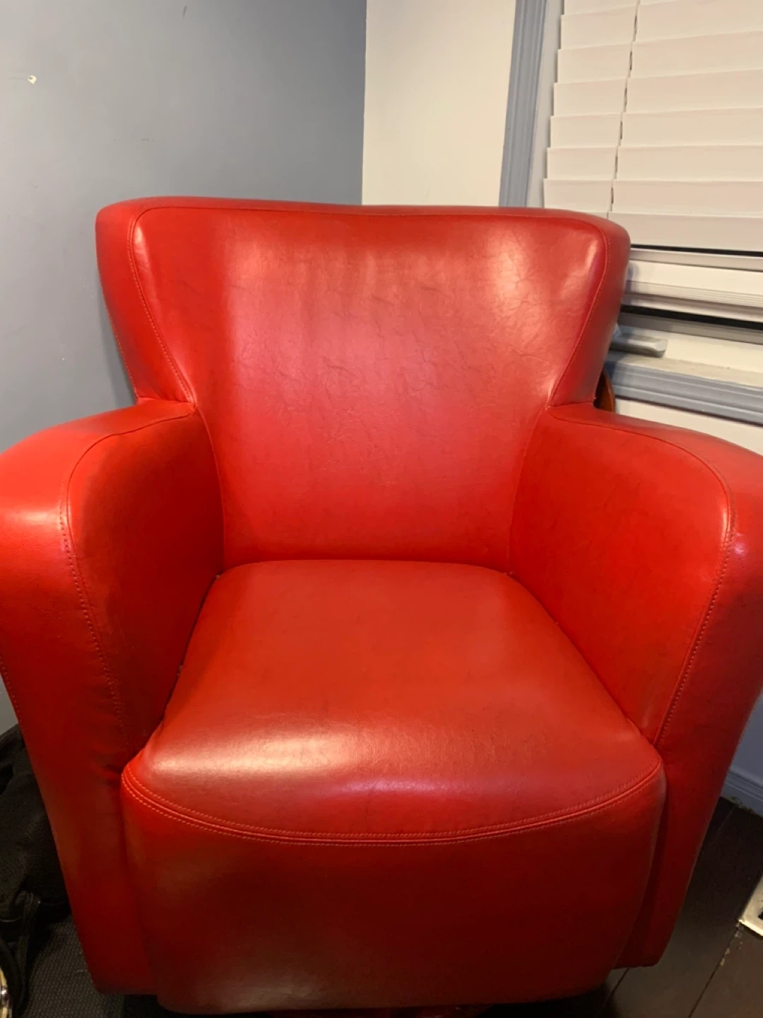 10A vibrant red leather armchair, perfect for adding a pop of colour to any room! There are some signs of wear, including a few scratches on the side, but it's still a comfortable and stylish piece of furniture
